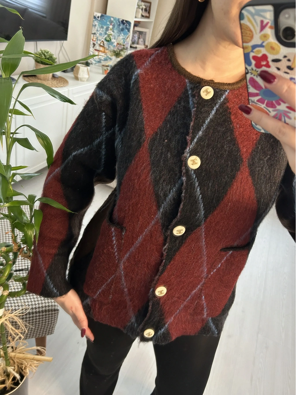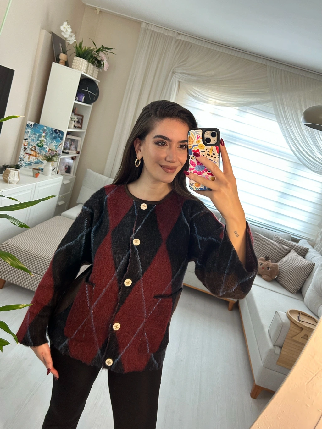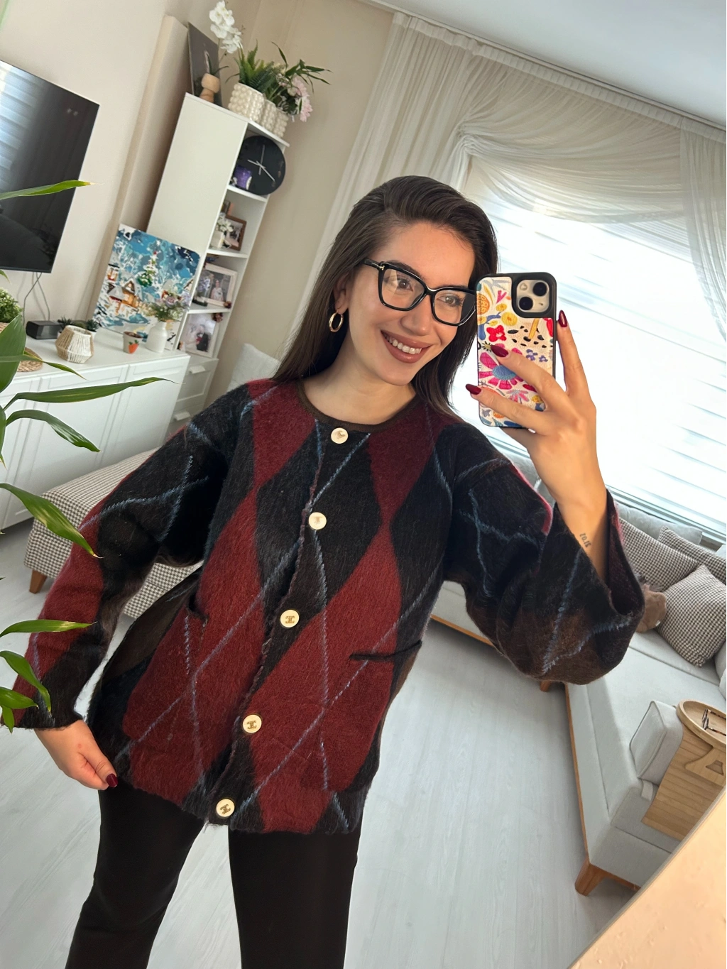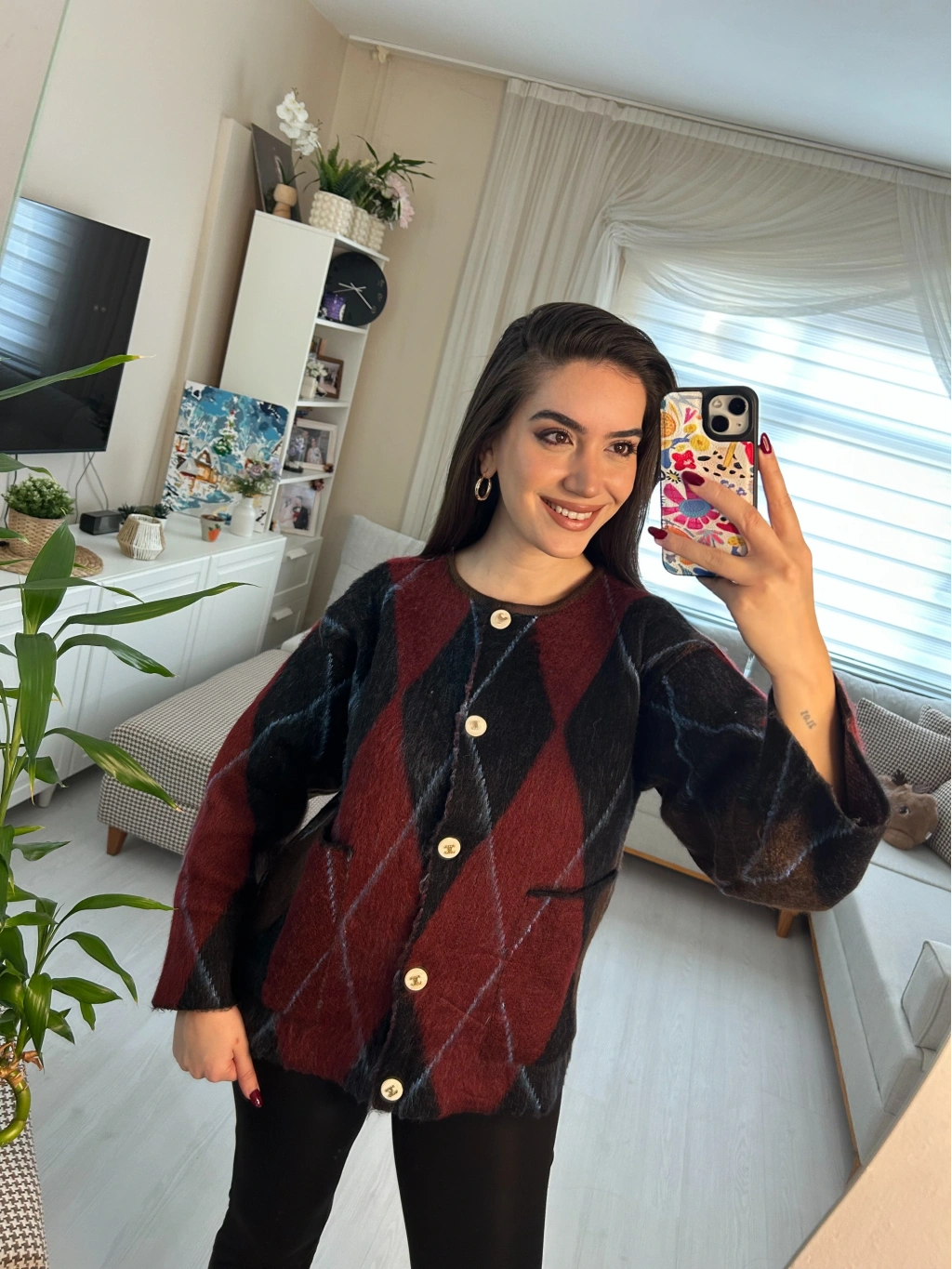 Bordo Siyah Baklava Desenli Gold Düğmeli Yumoş Hırka