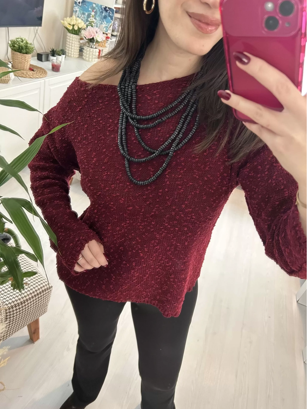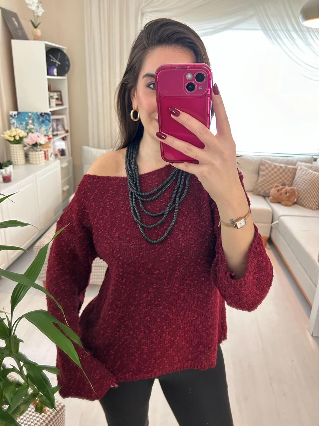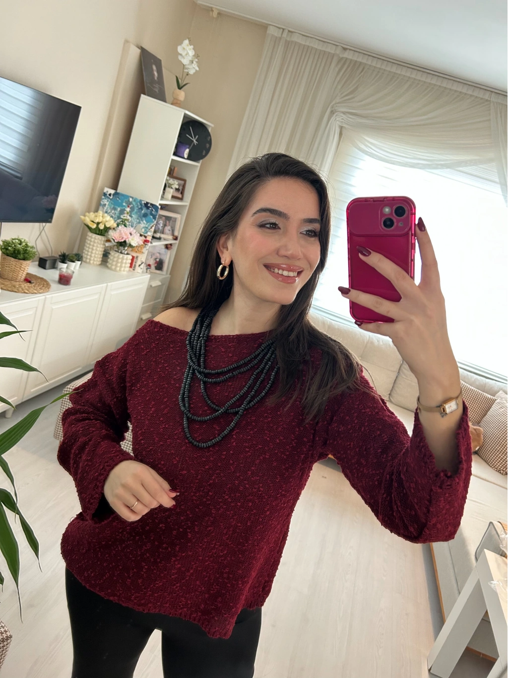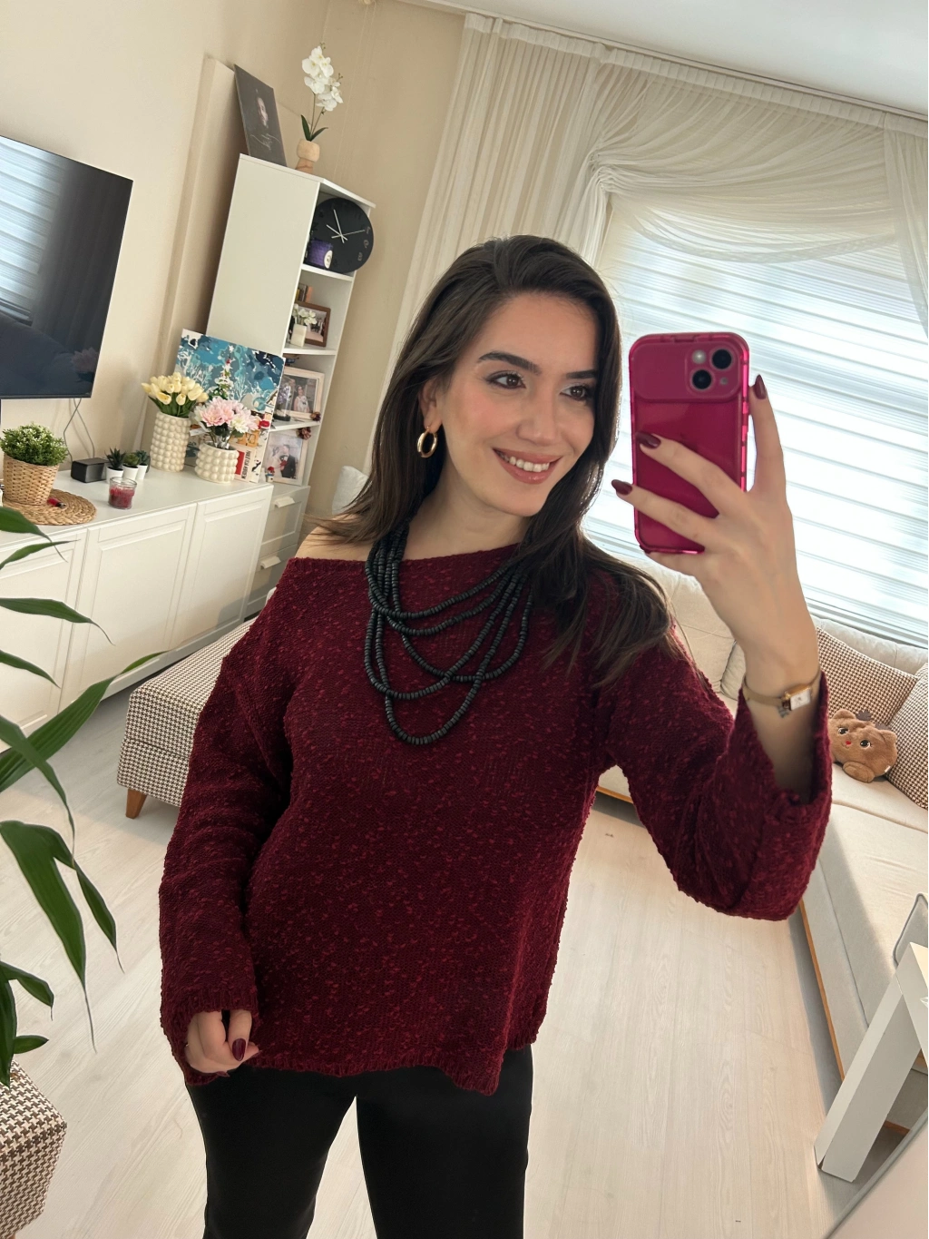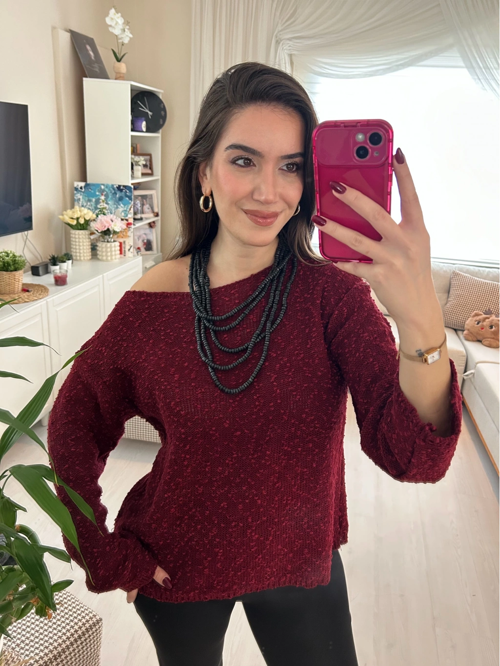 Selen Fashion’ın zarif tasarımlarından Bordo Yuvarlak Yaka Triko Kazak, kış gardırobunuzun en sevilen parçası olmaya aday.