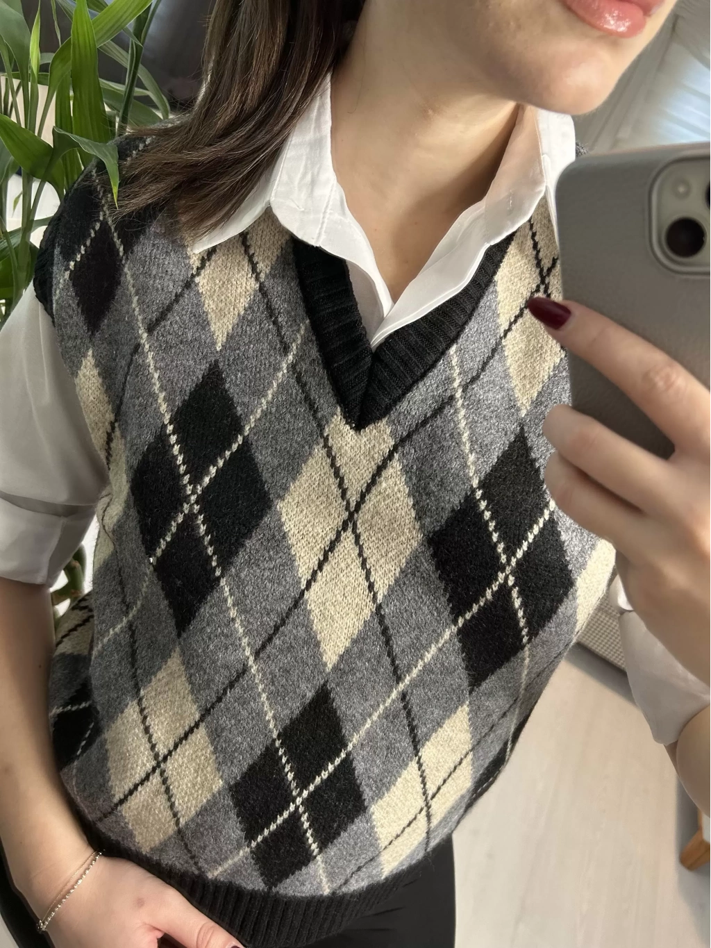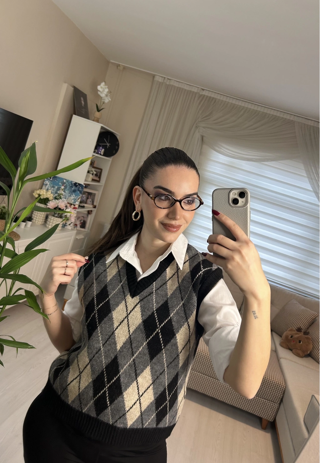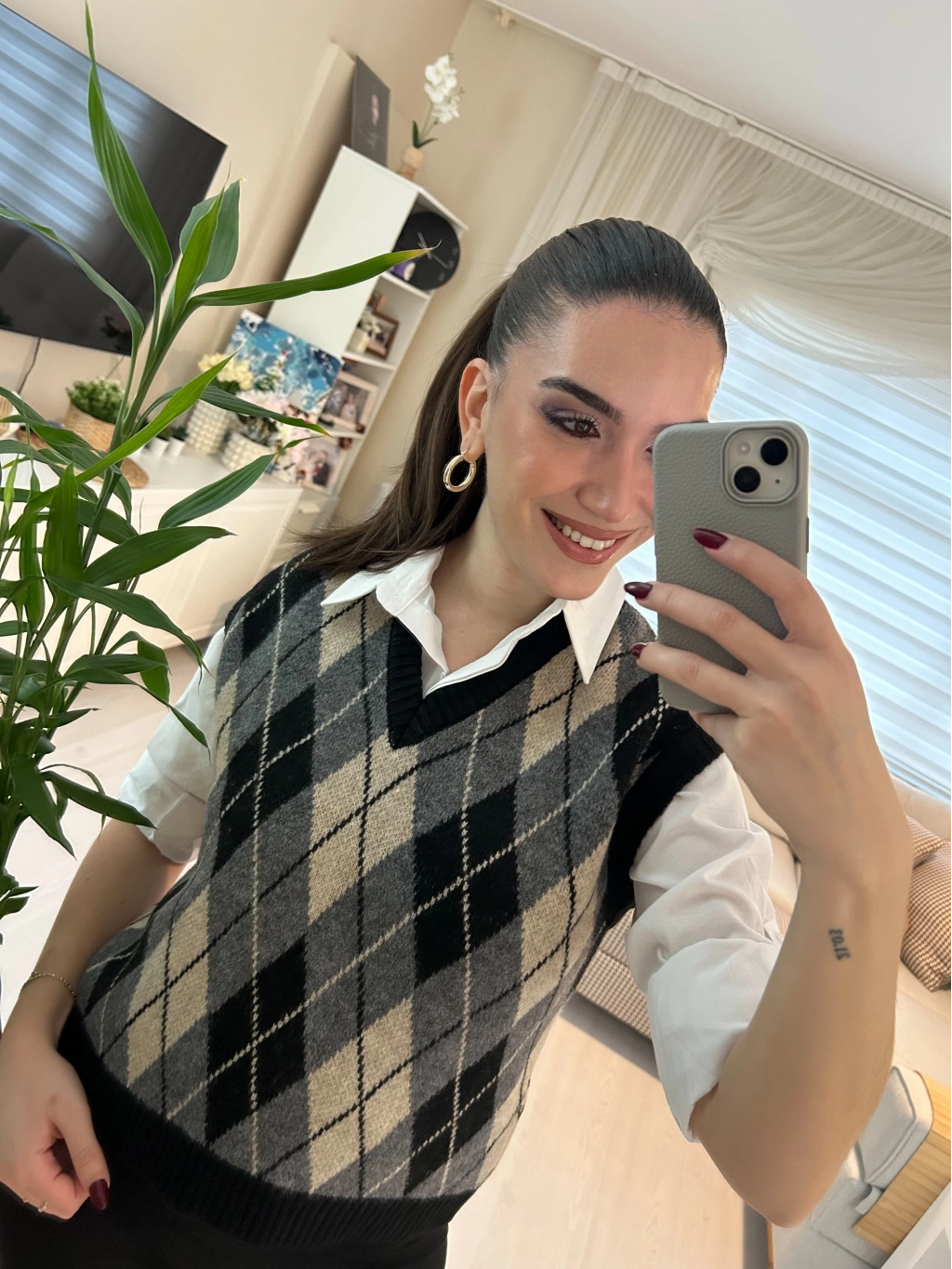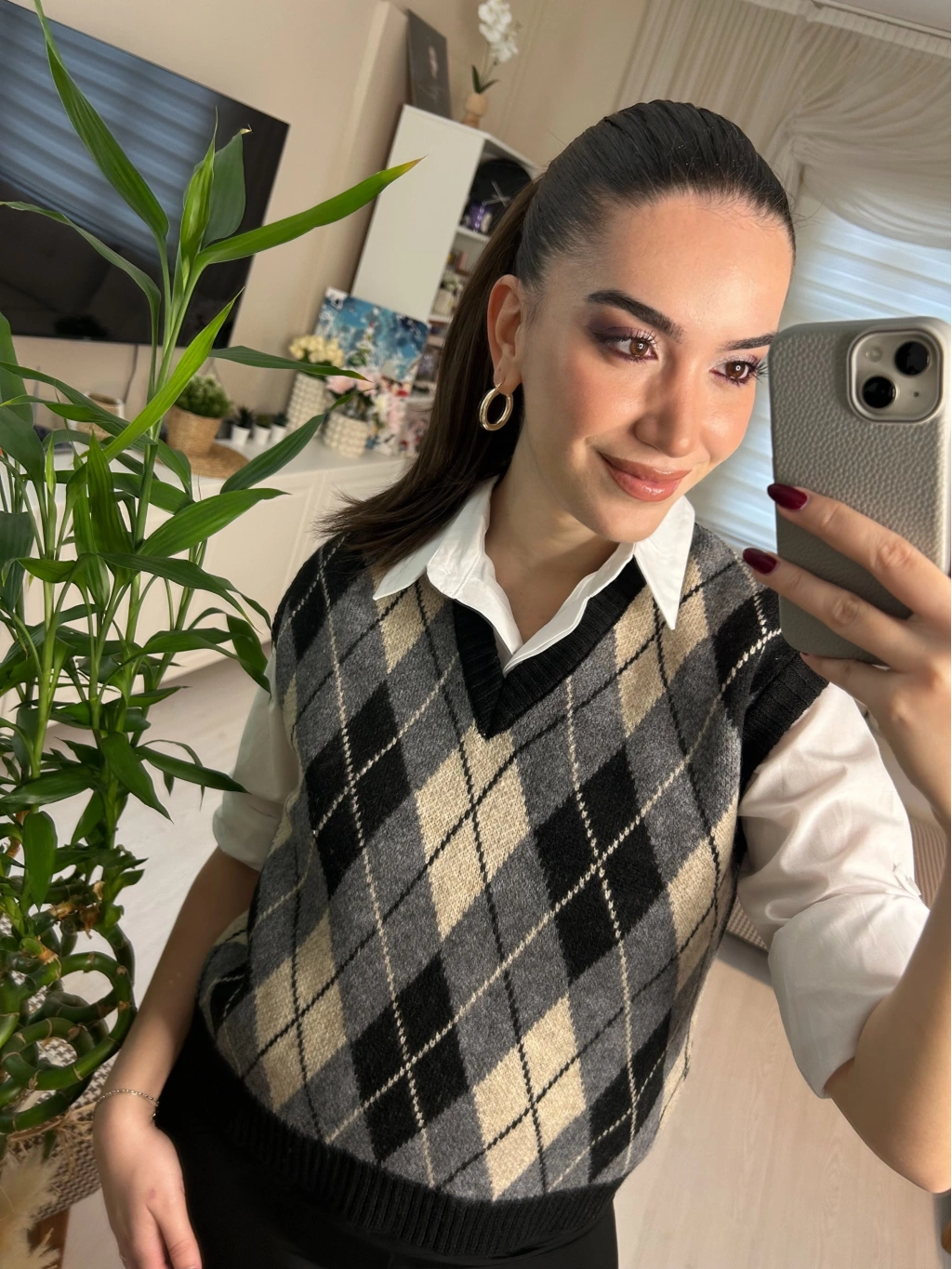 Şıklığı sade detaylarla yakalamak isteyenler için tasarlanan Selen Fashion ekose desenli siyah gri triko süveter, hem günlük hem ofis kombinlerinde zarif bir duruş sunar.
