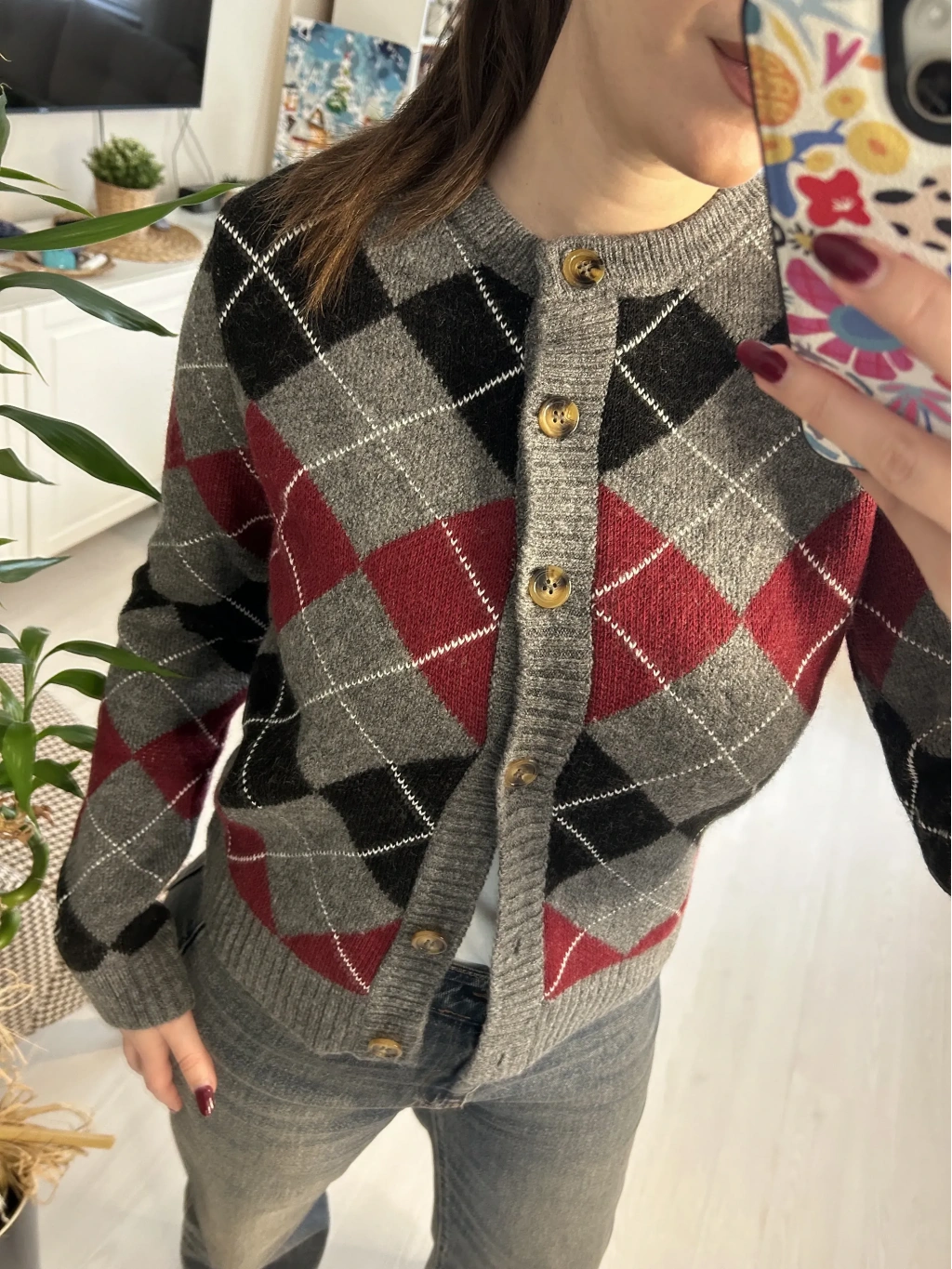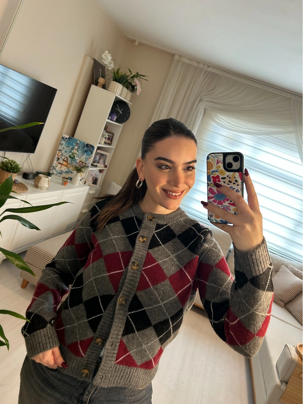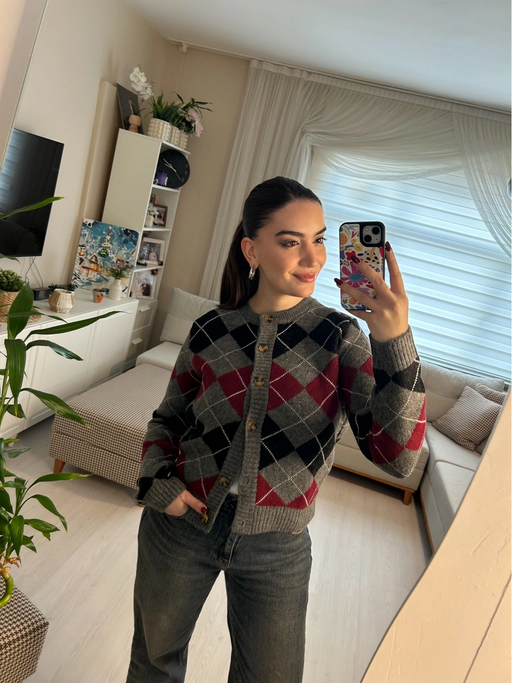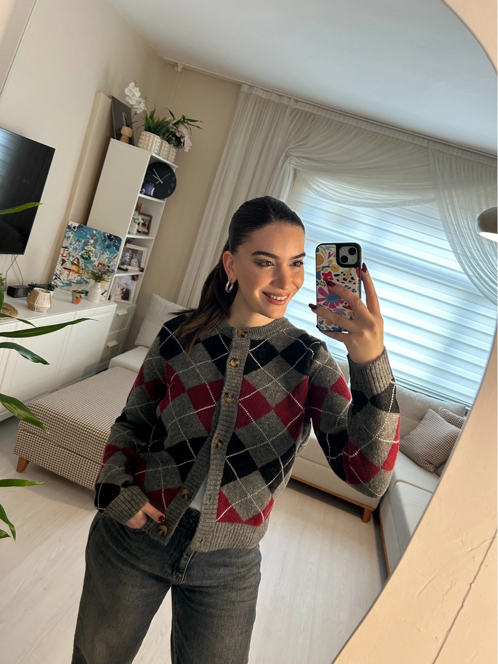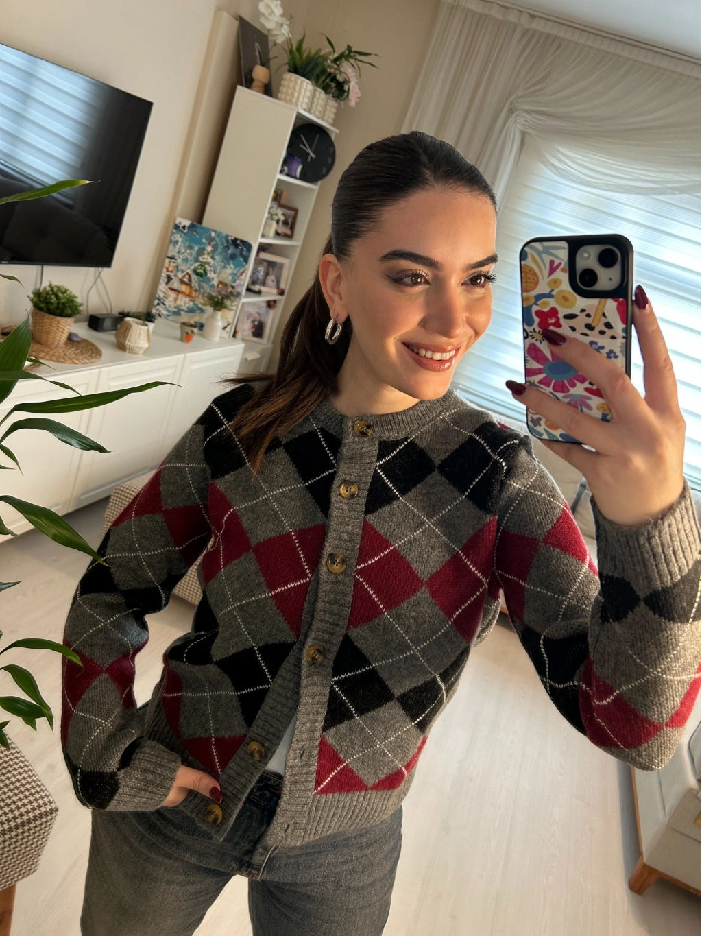 Zamansız klasik geri döndü! Gri, bordo ve siyah tonlarında baklava desenli, ahşap düğmeli triko hırka. Hem kolej havası hem modern şıklık bir arada, her kombine yakışır!