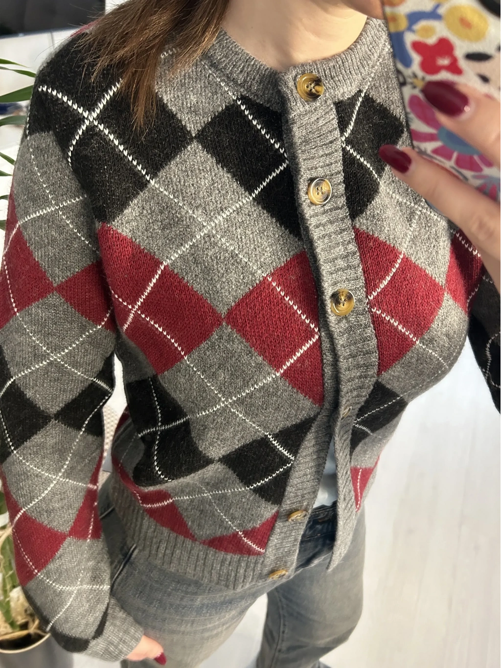 Gri Bordo Siyah Baklava Desenli Düğmeli Triko Hırka