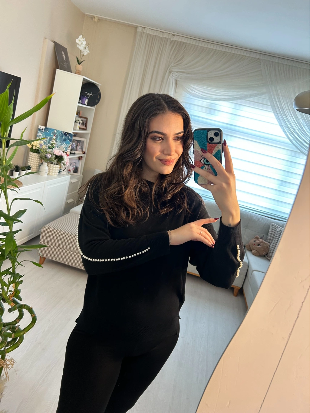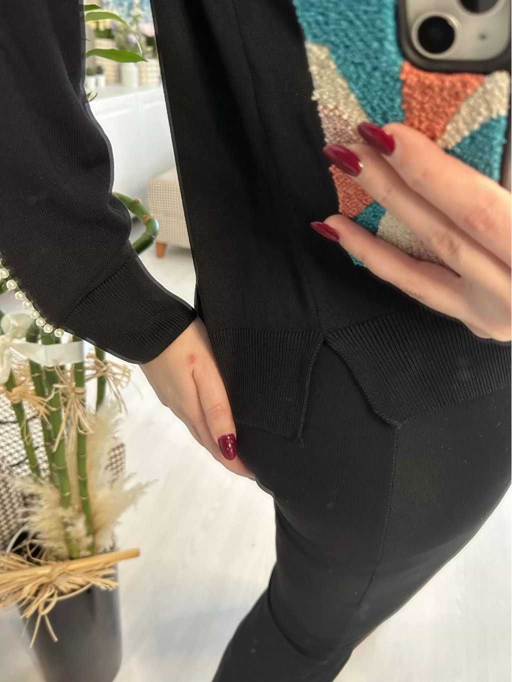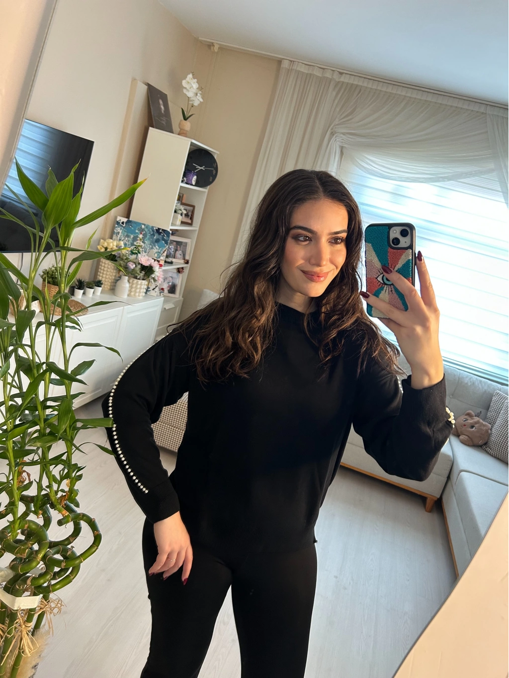 Selen Fashion'ın zarif ve modern tasarımlarından biri olan İnci Detaylı Siyah Triko Kazak, kol kısmındaki inci işlemeleriyle dikkat çekiyor. Yumuşak triko kumaşıyla konforu ön planda tutan bu kazak, her mevsim gardırobunuzun vazgeçilmezi olacak.