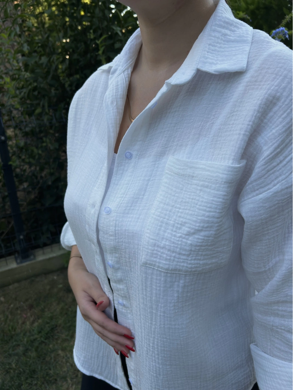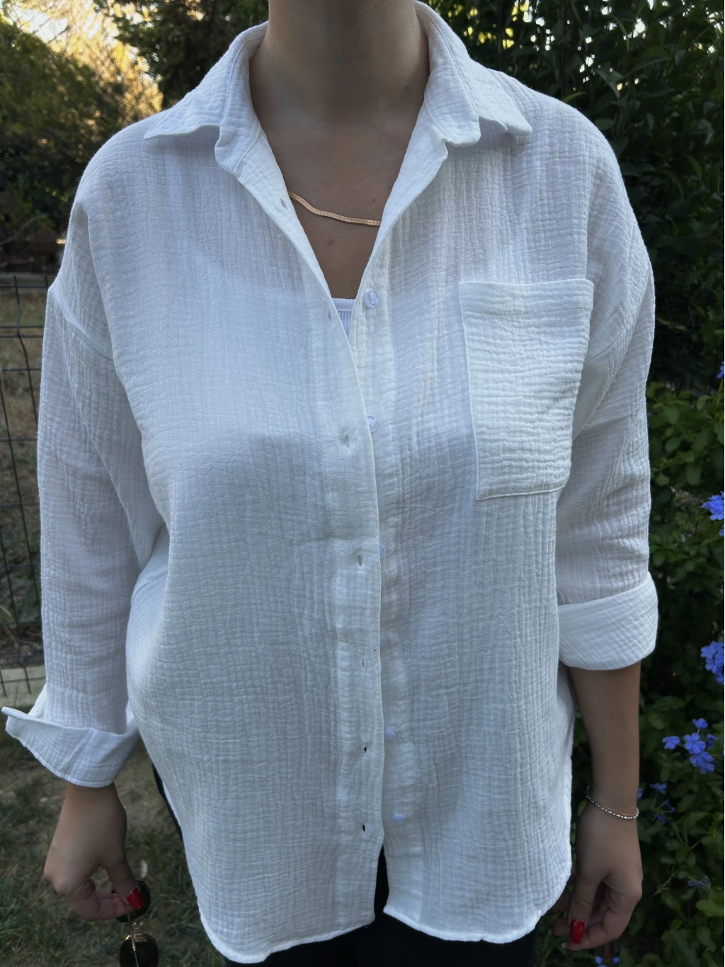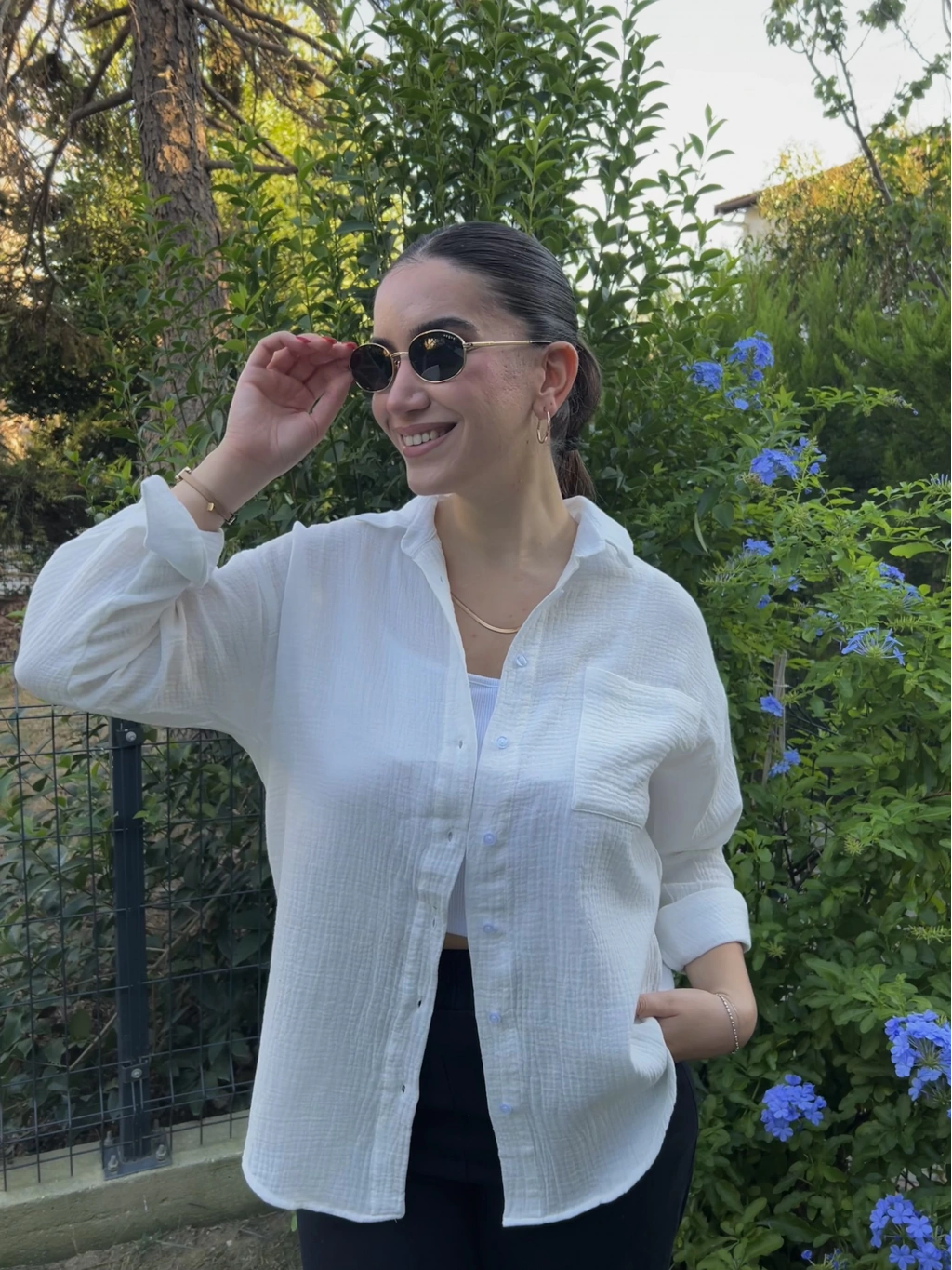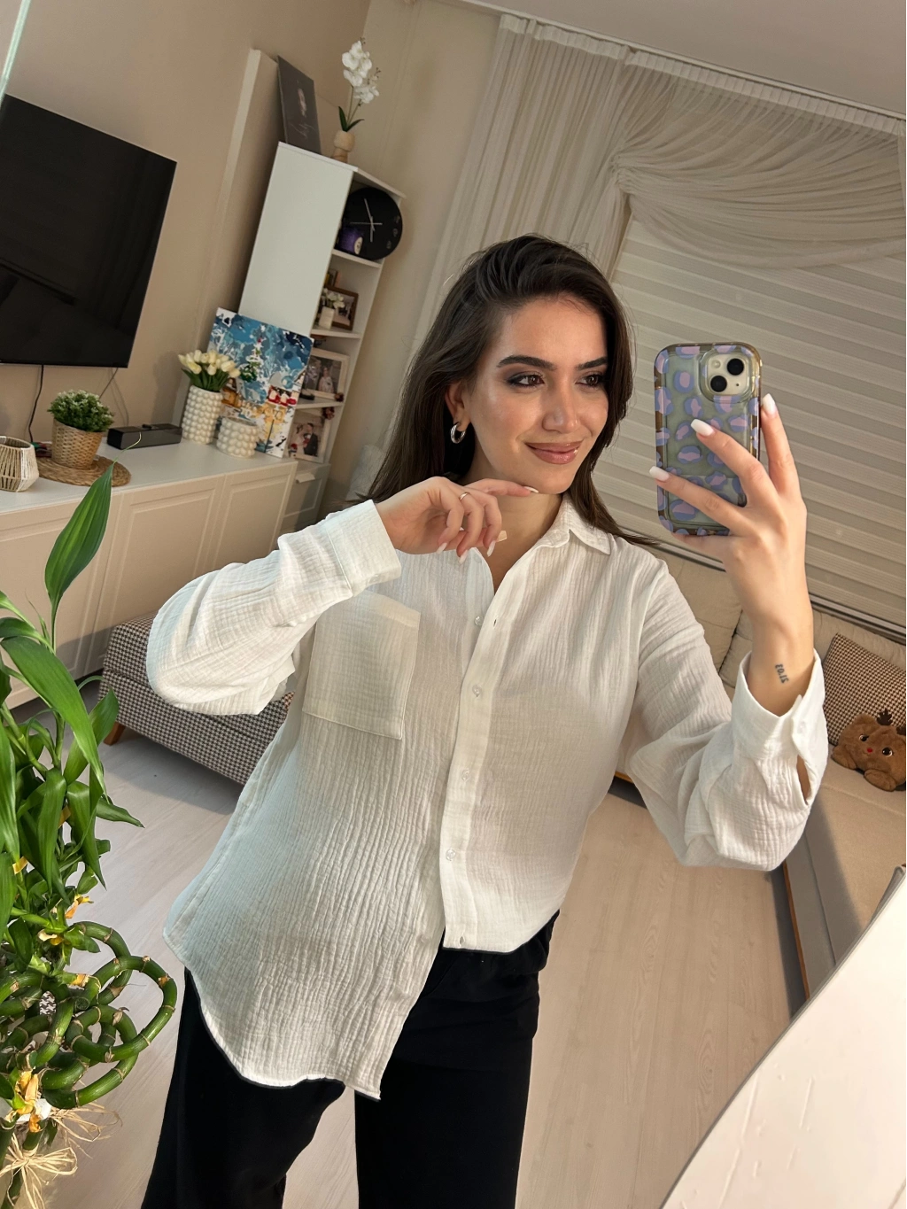 Kadın beyaz salaş dokulu gömlek, hafif ve nefes alabilen kumaşıyla günlük kullanıma uygundur. Salaş kesimi sayesinde rahat bir kullanım sunarken, cepli detayıyla şıklık kazandırır. Hem casual hem de şık kombinlerde tercih edilebilir.
