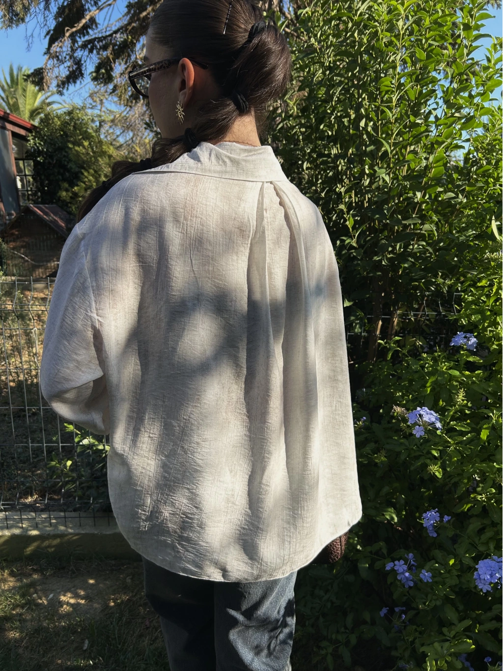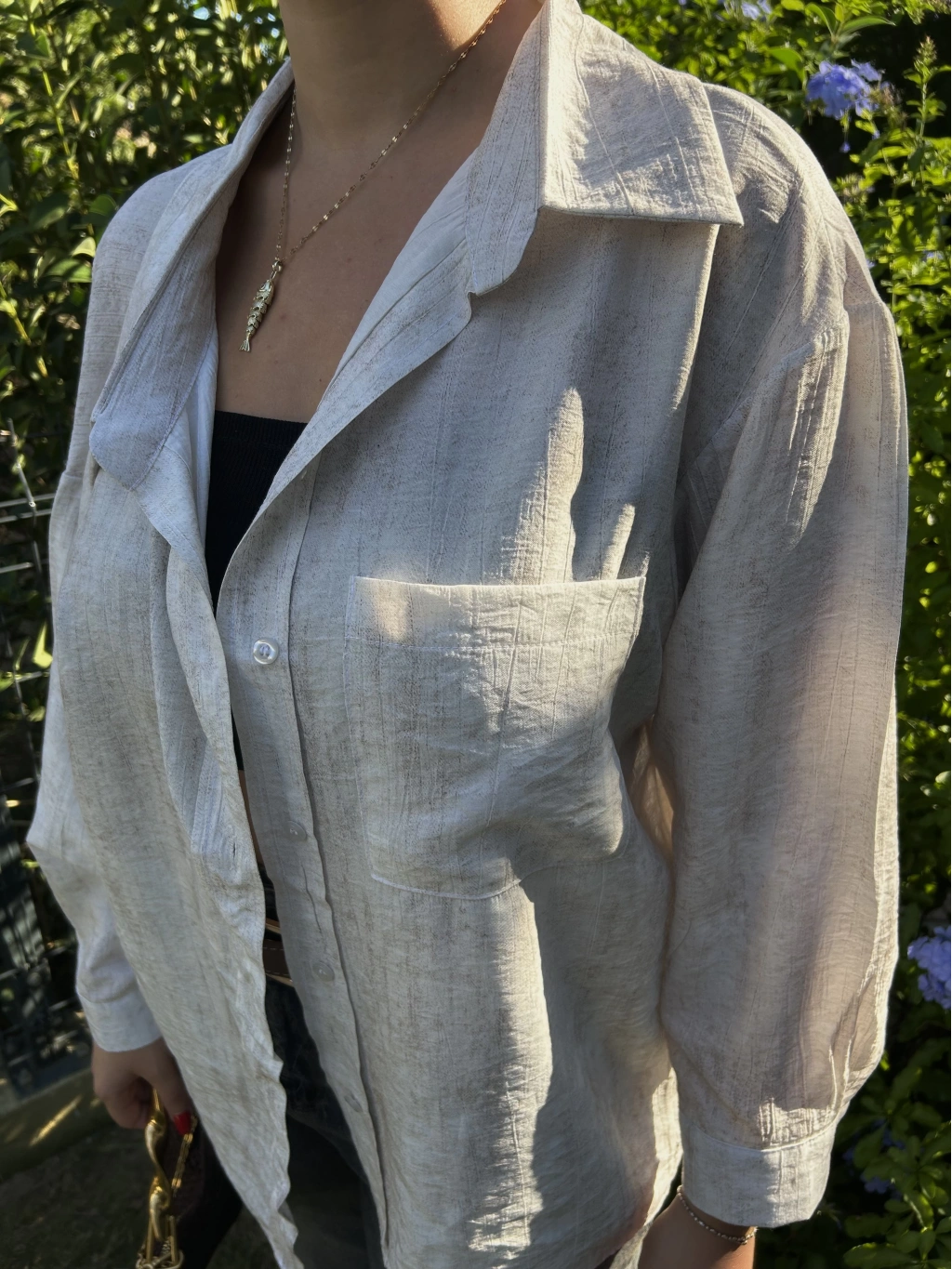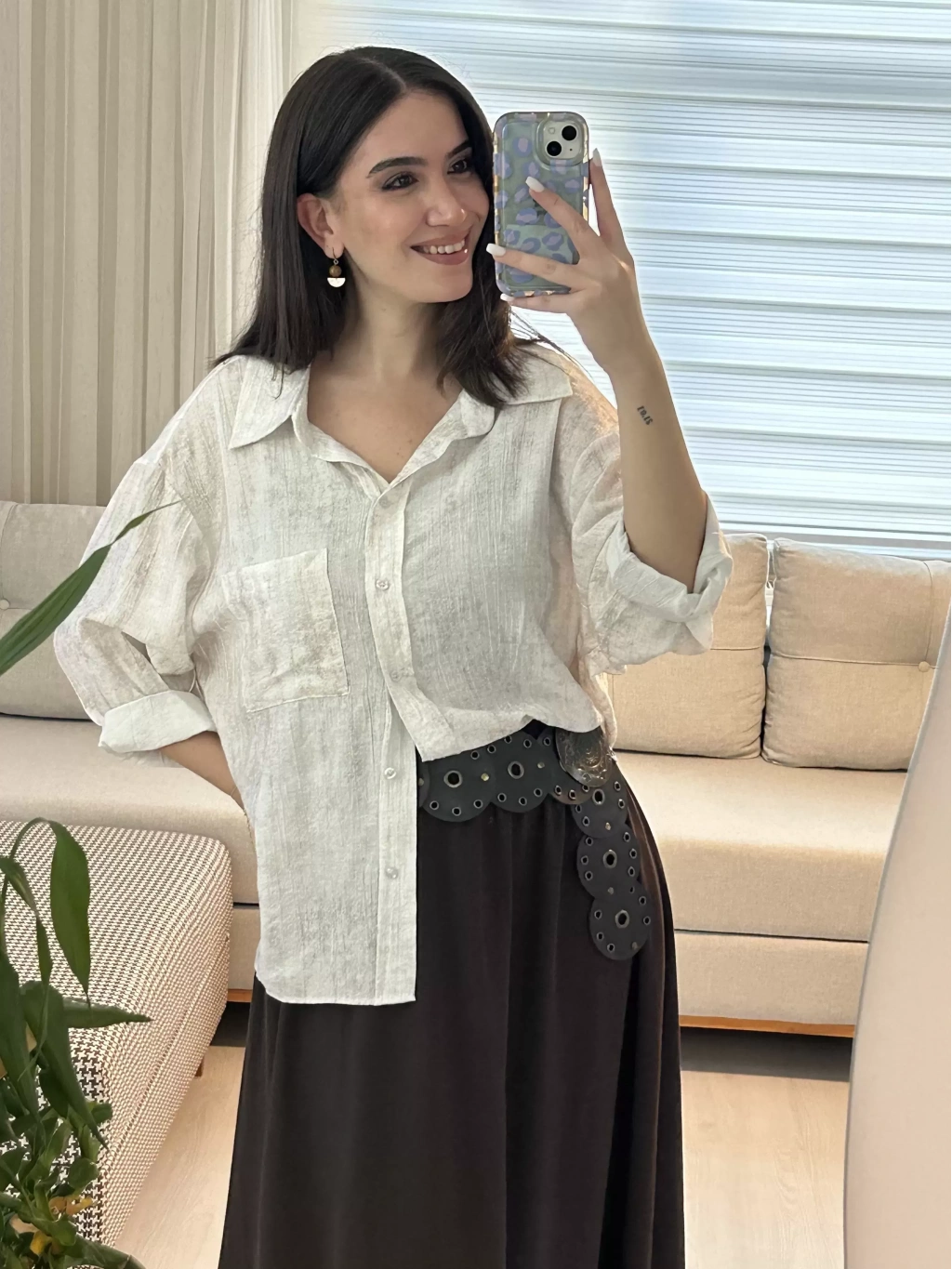 Kadın ekru salaş keten gömlek, hafif ve nefes alan kumaşıyla gün boyu konfor sağlar. Oversize tasarımı sayesinde hem günlük hem de şık kombinlerde kullanılabilir. Mevsim geçişlerinde rahatlıkla tercih edilebilecek zamansız bir parçadır.