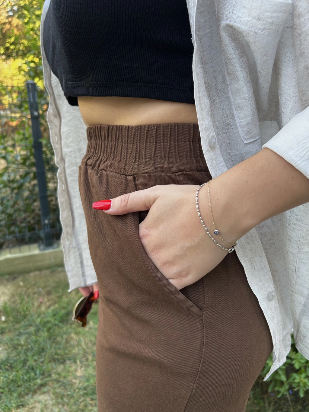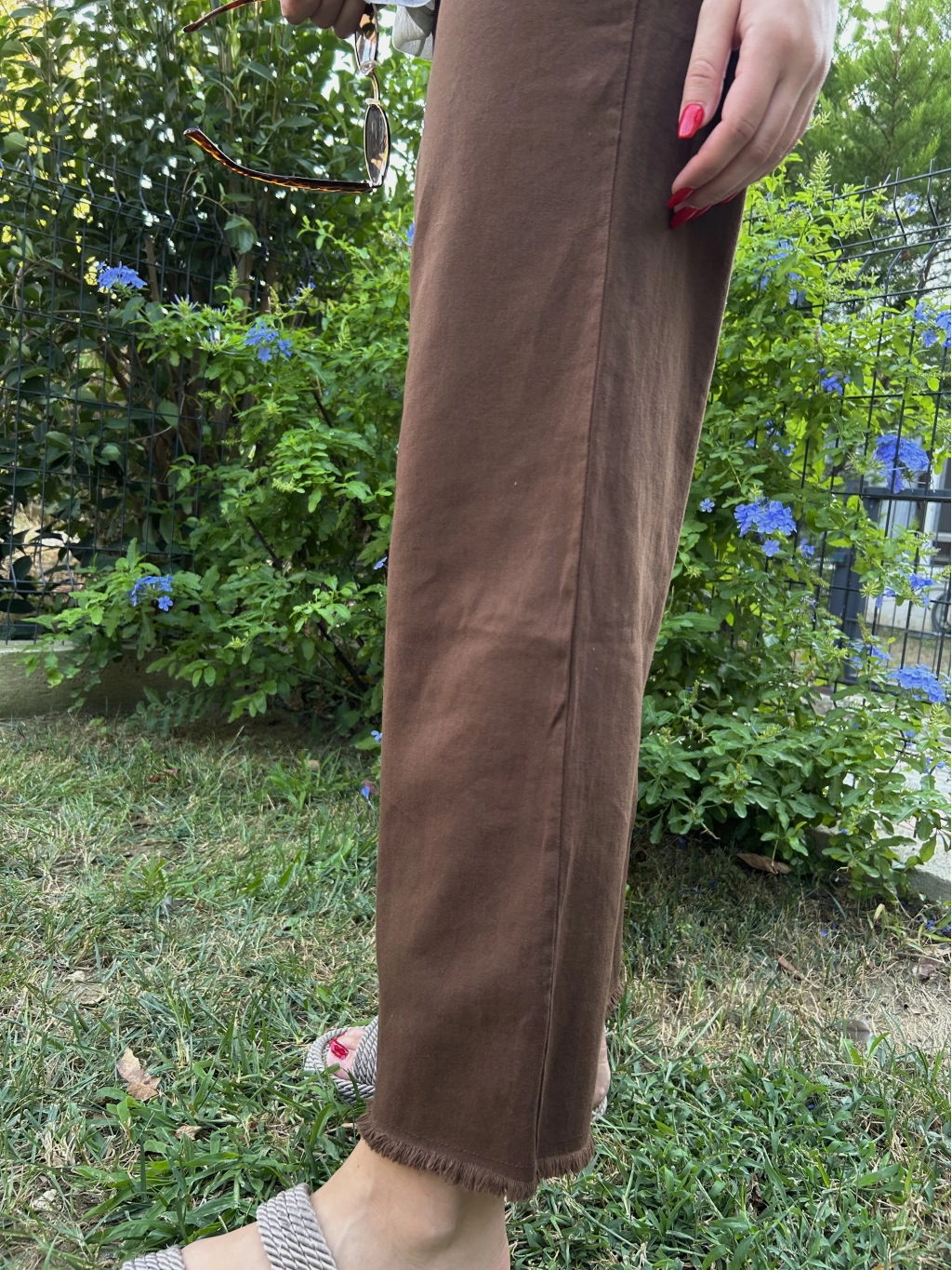 Kadın kahverengi püskül paça pantolon, rahat kalıbı ve modern görünümüyle günlük kullanıma uygundur. Dayanıklı kumaşı sayesinde uzun süre kullanım imkanı sunar. Düz kesim yapısı ve paça detayı ile farklı kombinlere kolayca uyum sağlar.