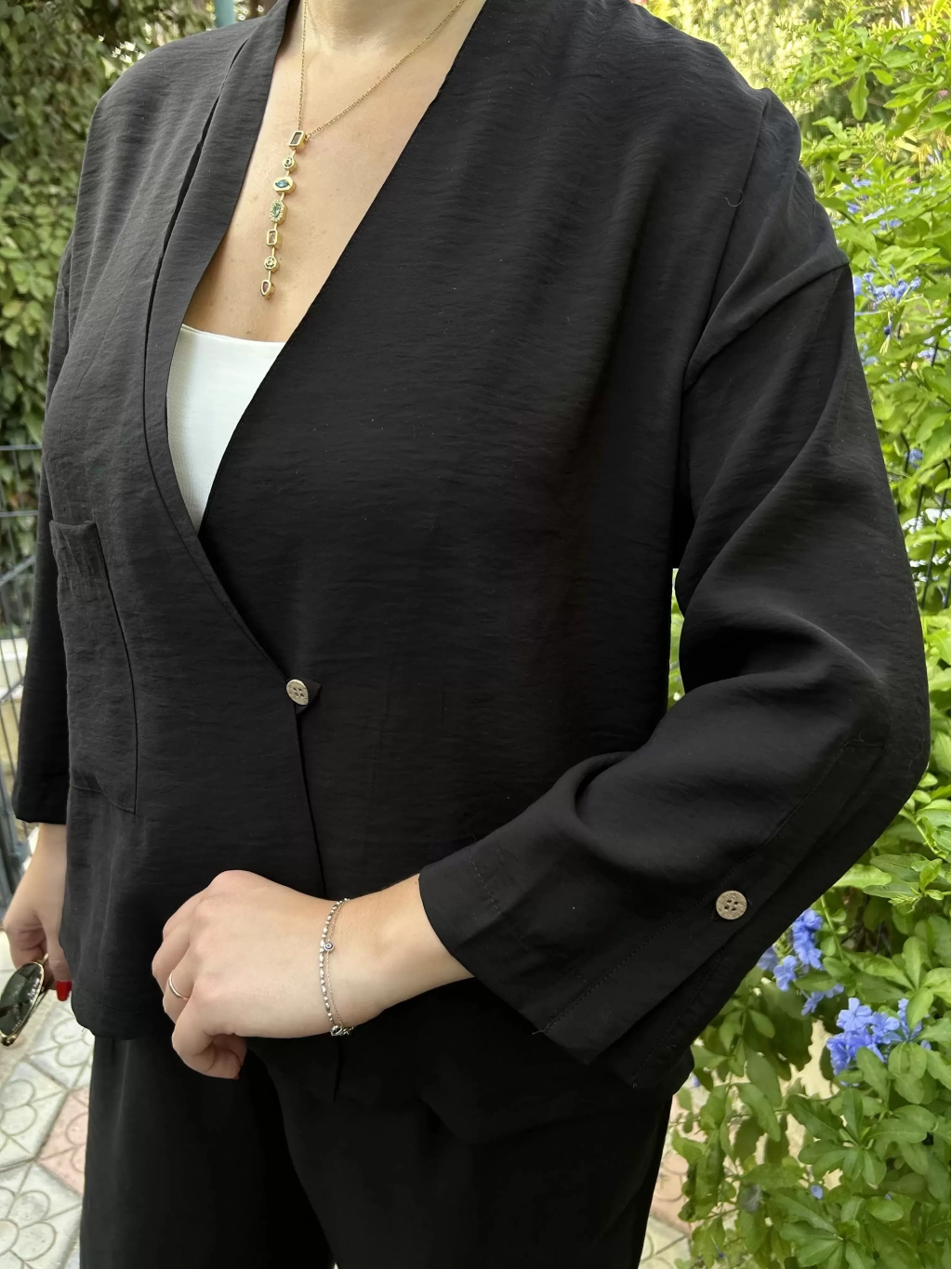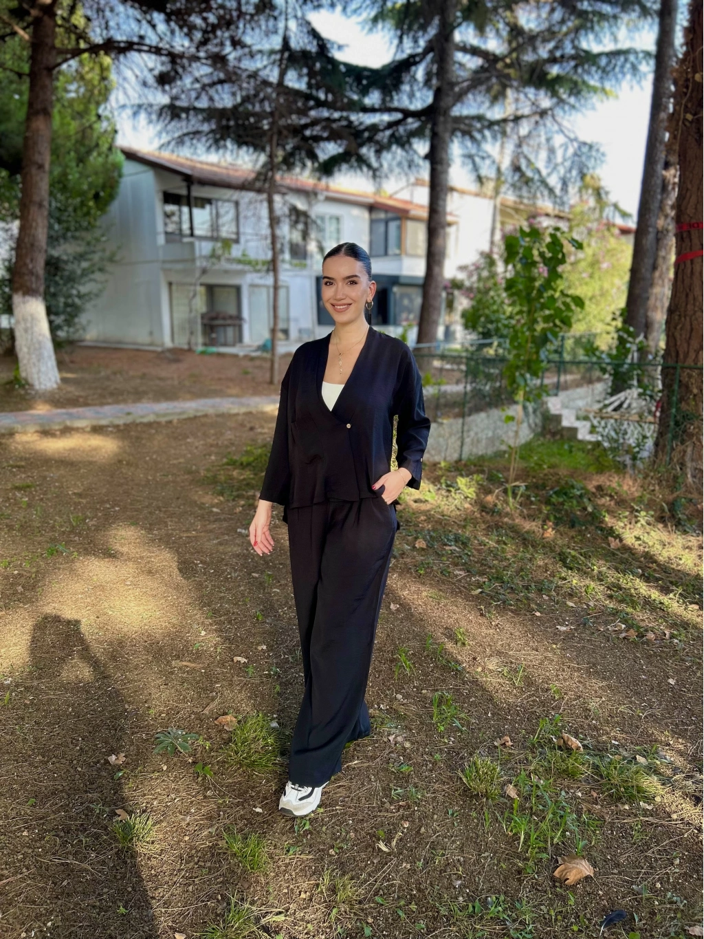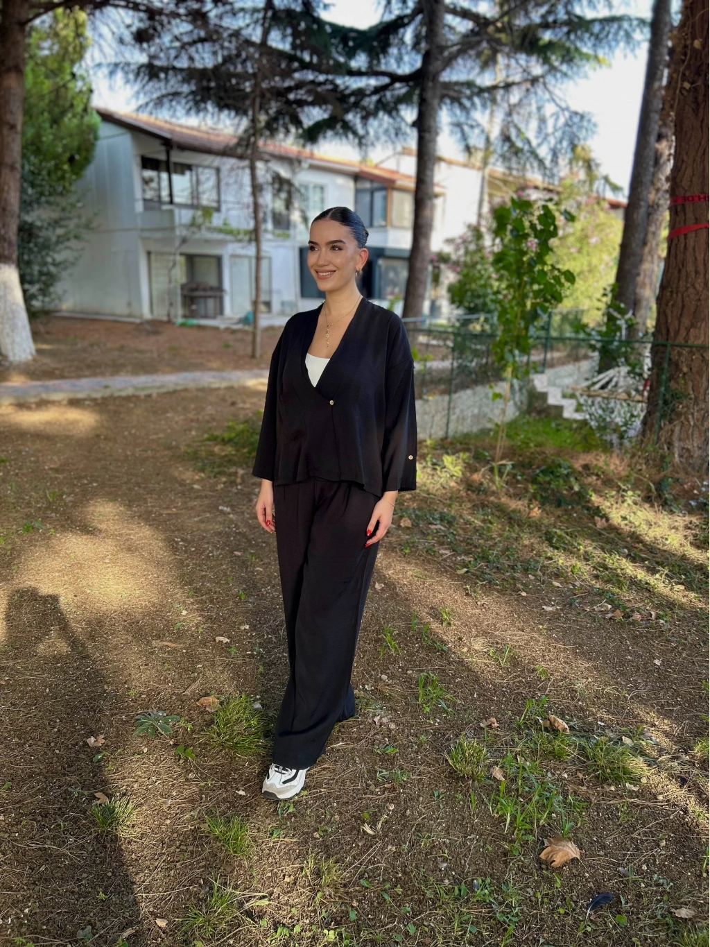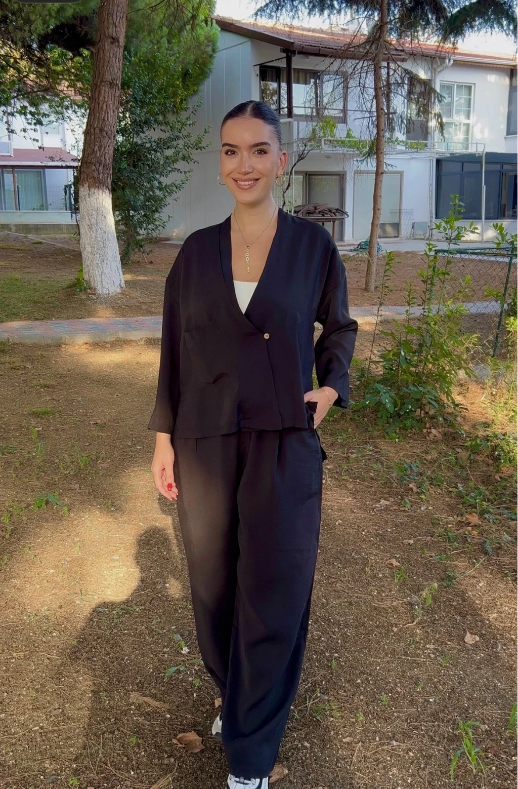 Kadın siyah salaş ikili takım, rahat kesimi ve zarif görünümüyle hem günlük kullanım hem de özel günler için uygundur. Hafif kumaşı sayesinde konforlu bir deneyim sunar. Minimal tasarımıyla farklı kombinlere uyum sağlar.