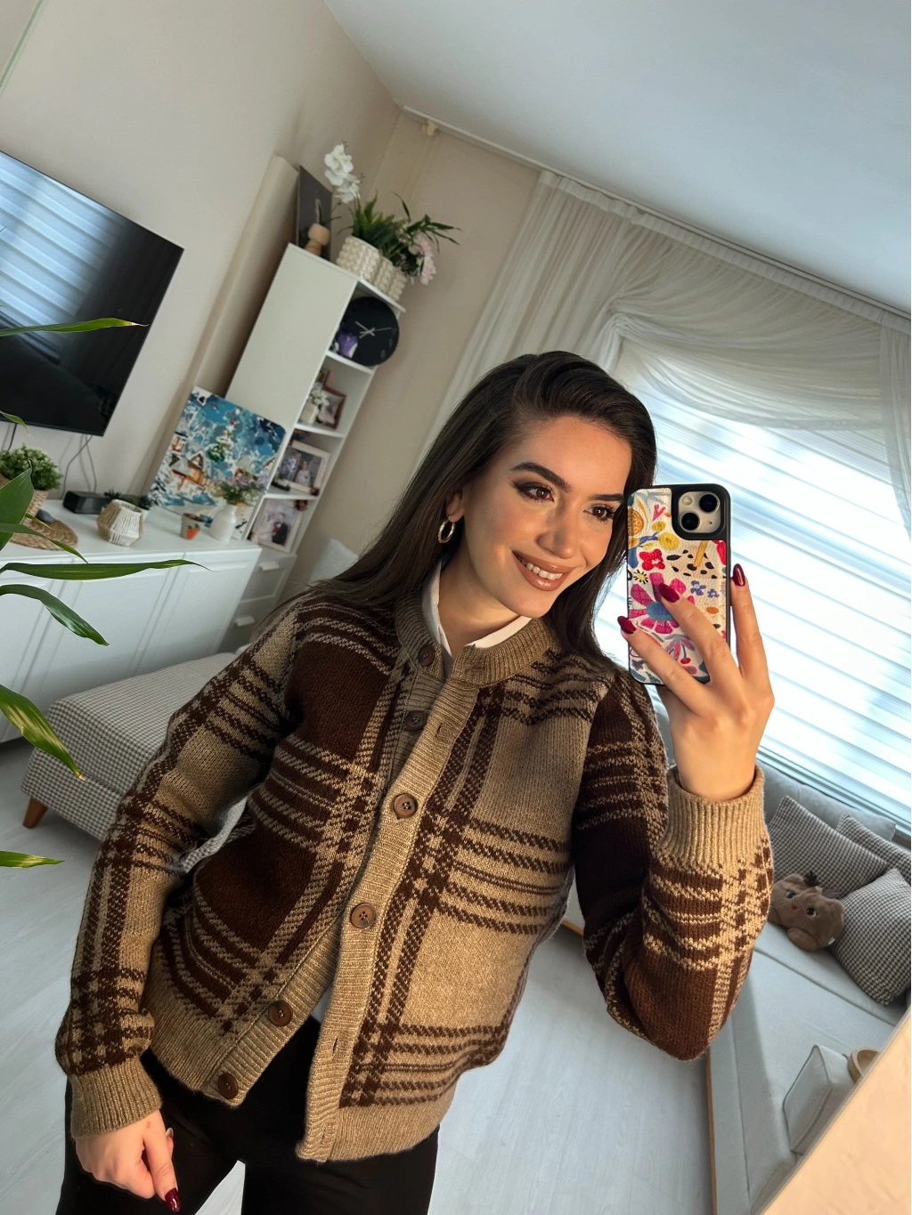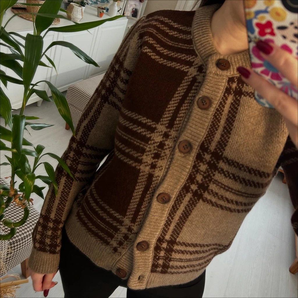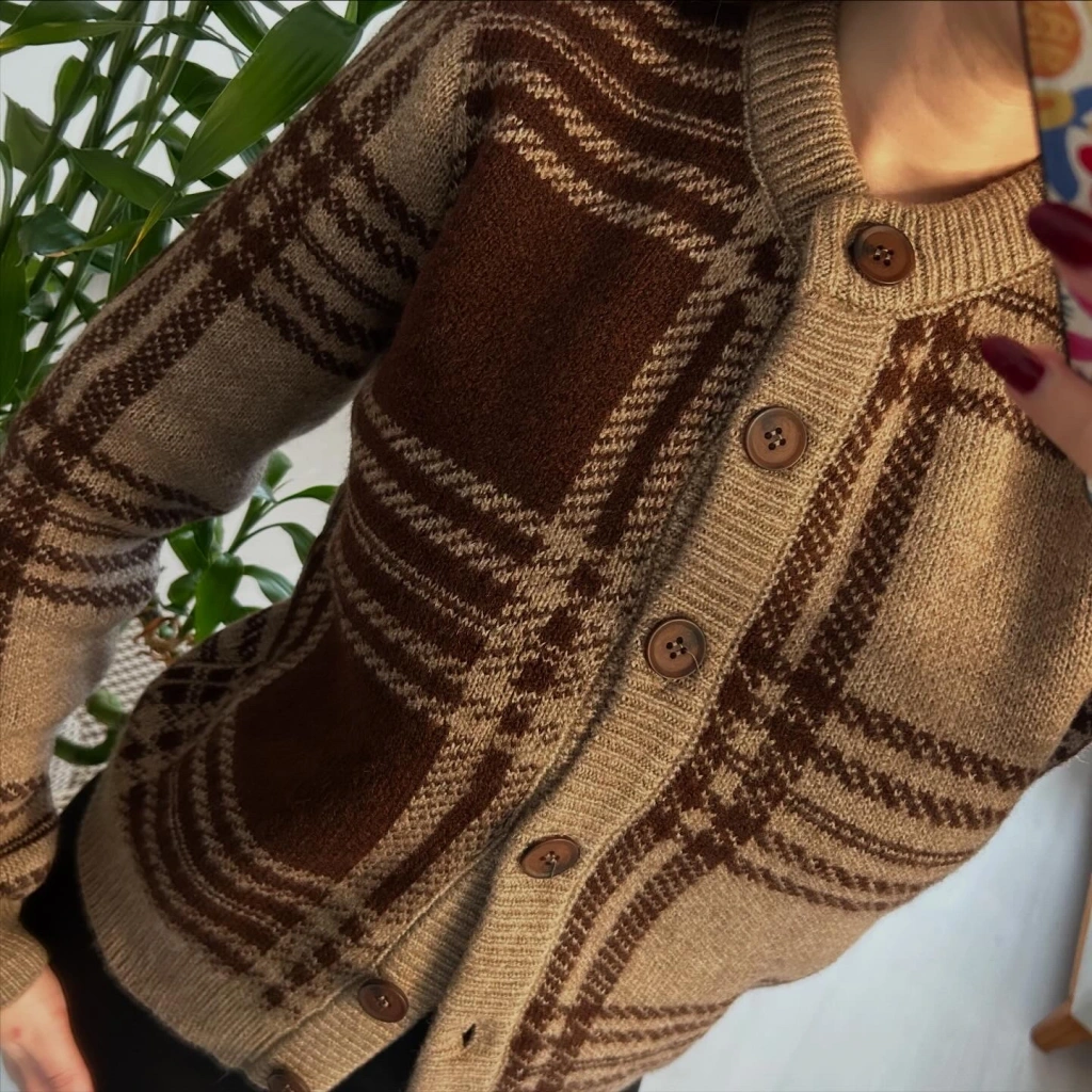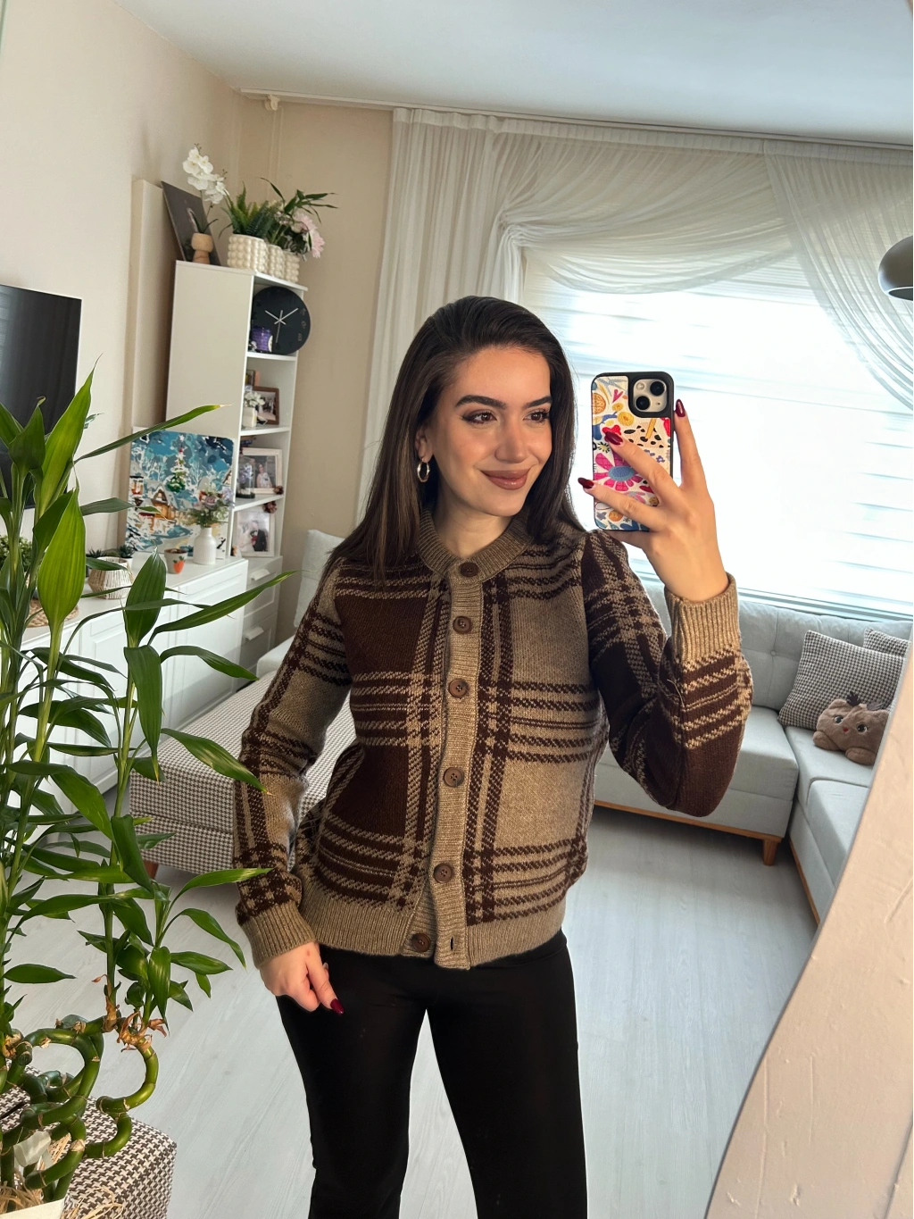 Retro esintili kahve tonlarında ekose desenli triko hırka! Düğmeli önü ve yumuşacık dokusuyla hem şık hem de sıcacık. Günlük stilinden ofis kombinlerine kadar her anınıza uyum sağlar.