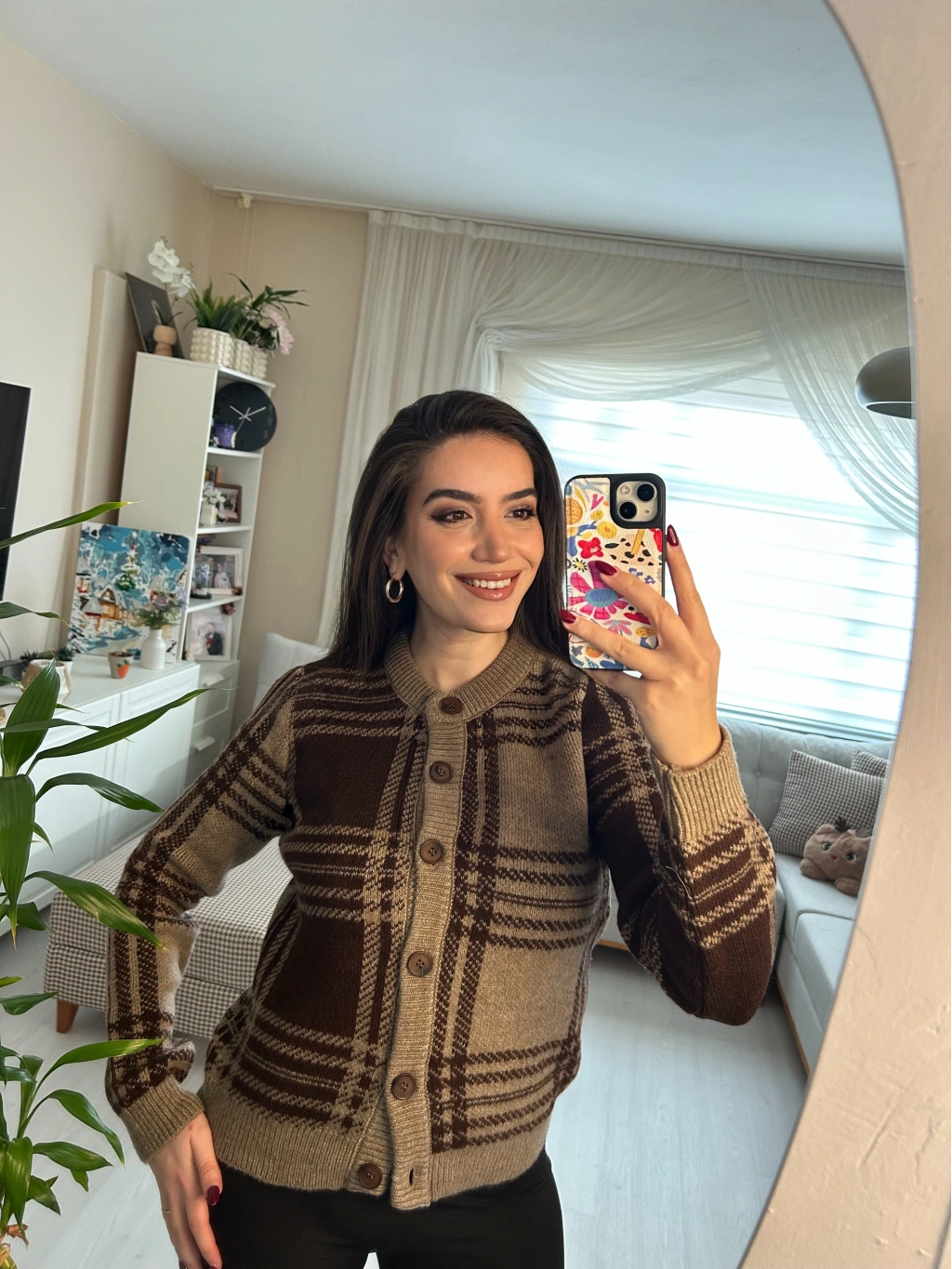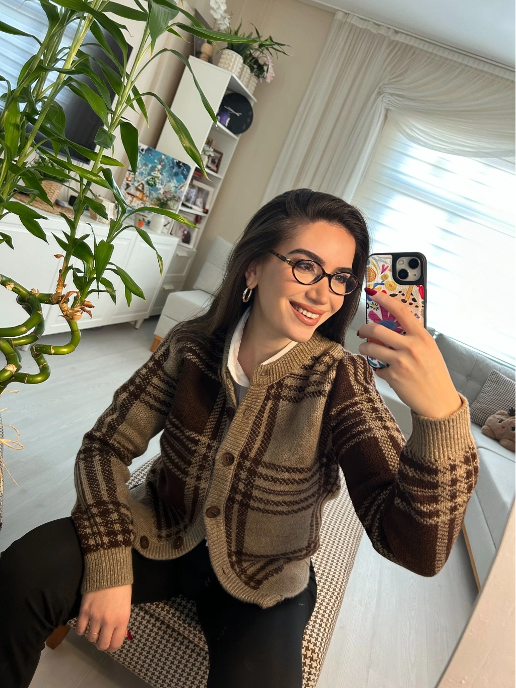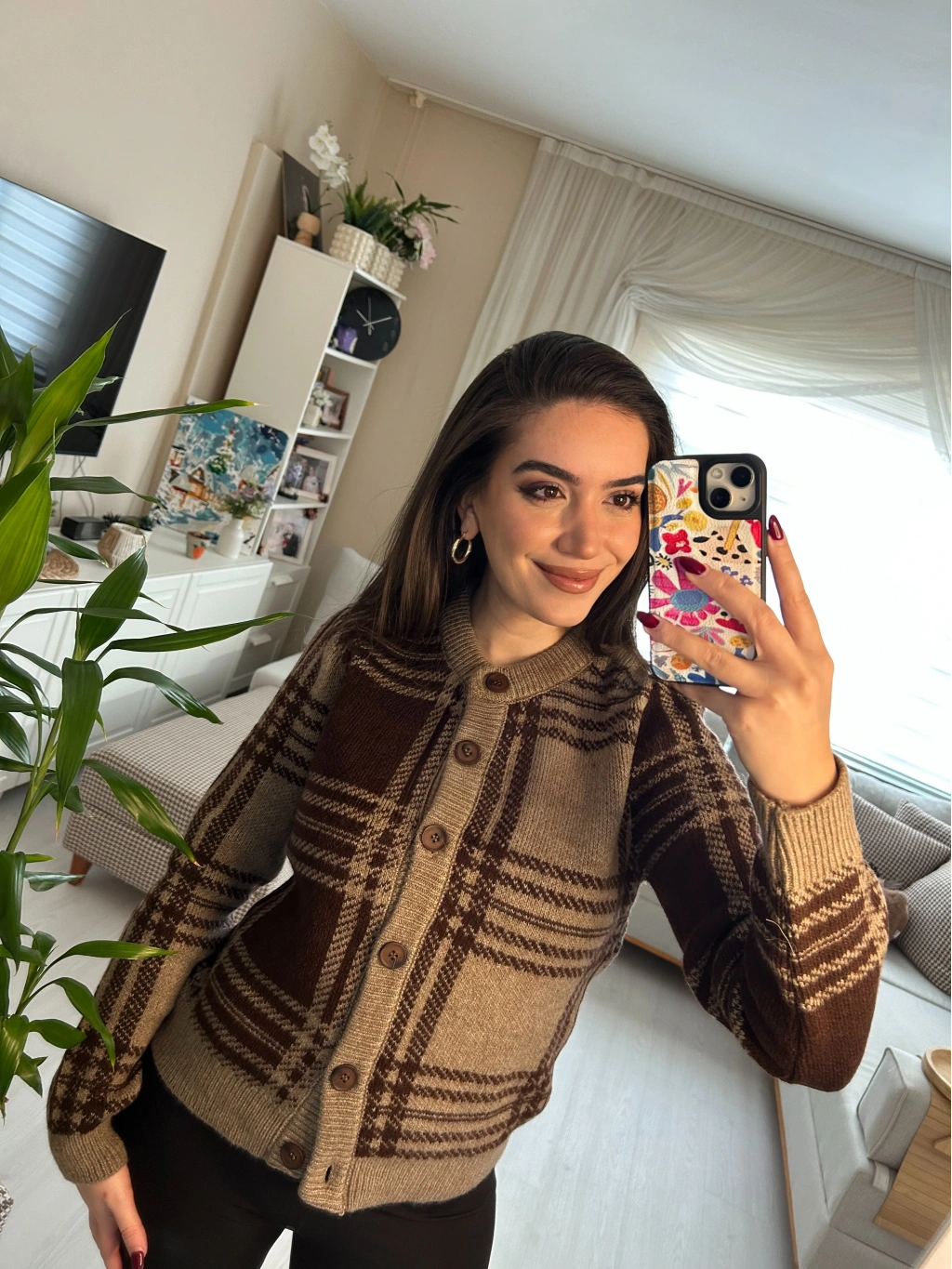 Retro esintili kahve tonlarında ekose desenli triko hırka! Düğmeli önü ve yumuşacık dokusuyla hem şık hem de sıcacık. Günlük stilinden ofis kombinlerine kadar her anınıza uyum sağlar.