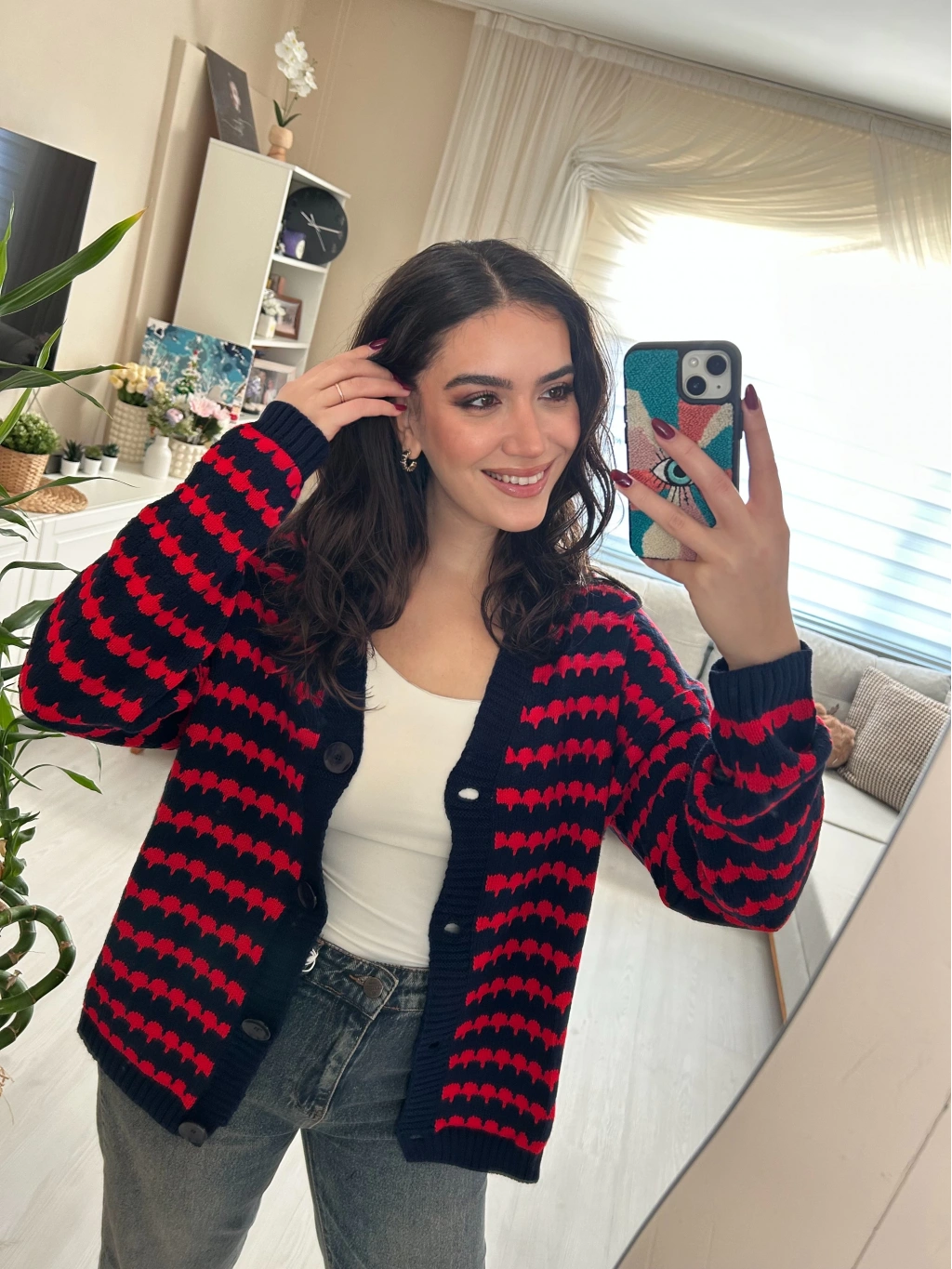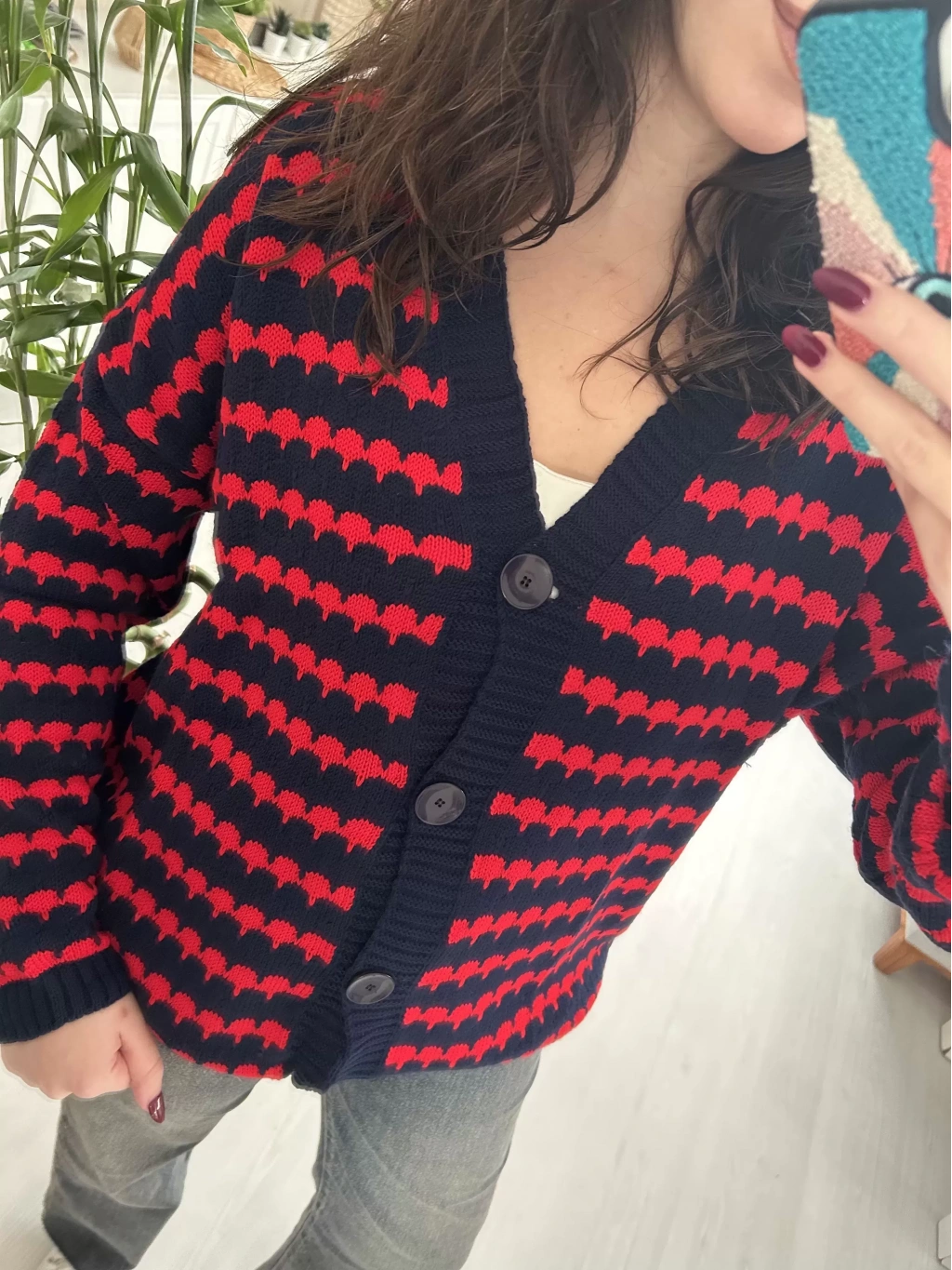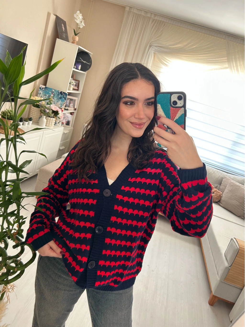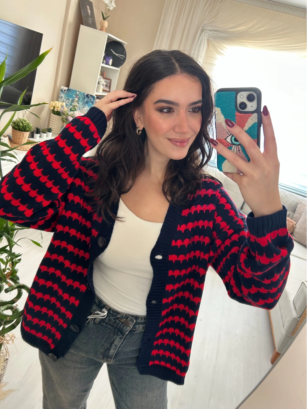 Selen Fashion’ın zamansız tasarımlarından biri olan bu triko hırka, soğuk havalarda konforu ve tarzı bir araya getiriyor. Lacivert zemin üzerine kırmızı desenleriyle enerjik bir görünüm sunan model, günlük ve casual kombinlerin vazgeçilmezi olmaya aday. Düğmeli tasarımı sayesinde ister açık ister kapalı olarak kullanılabilir.