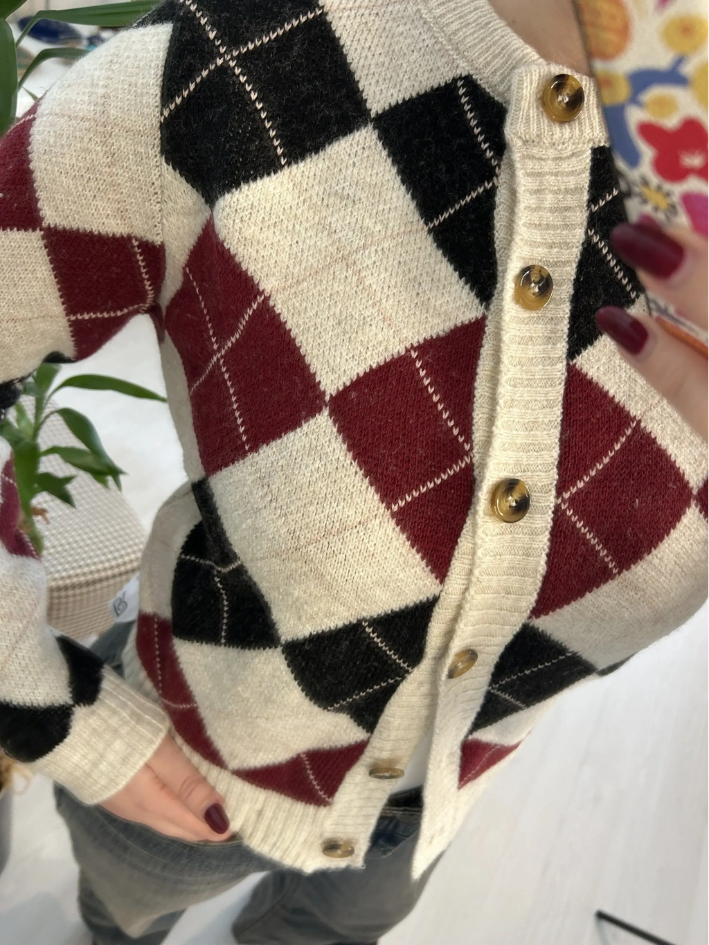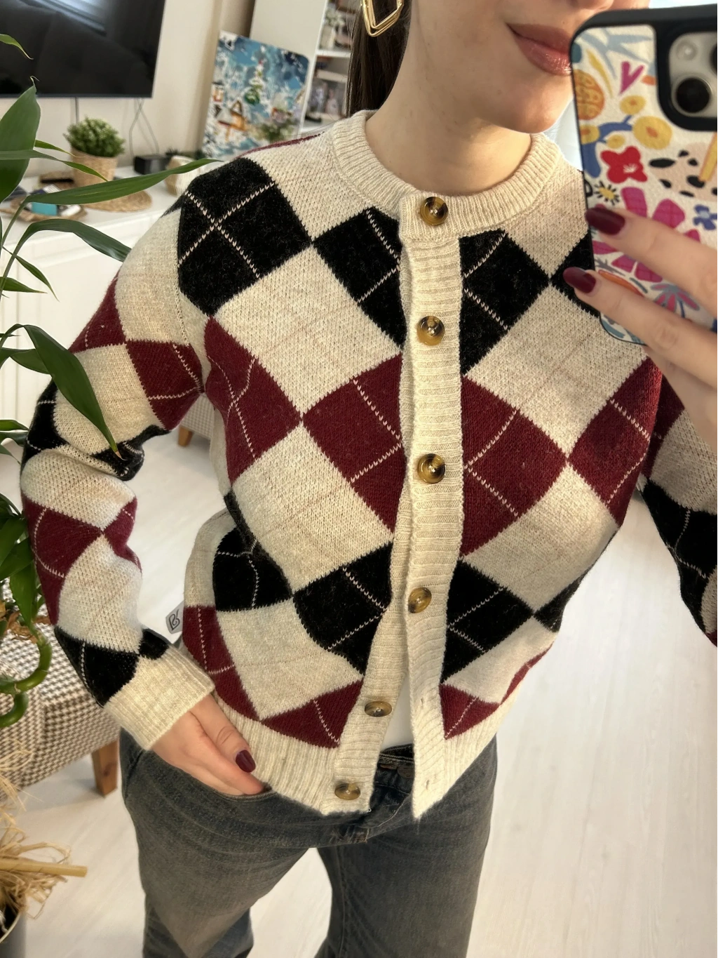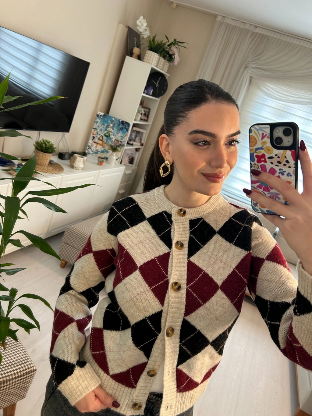 Sezonun en tatlı hırkası! Krem, bordo ve siyah tonlarında klasik baklava deseniyle hazırlanan crop boy düğmeli triko hırka. Hem retro hem modern, yüksek bel jean ve eteklerle harika duruyor!