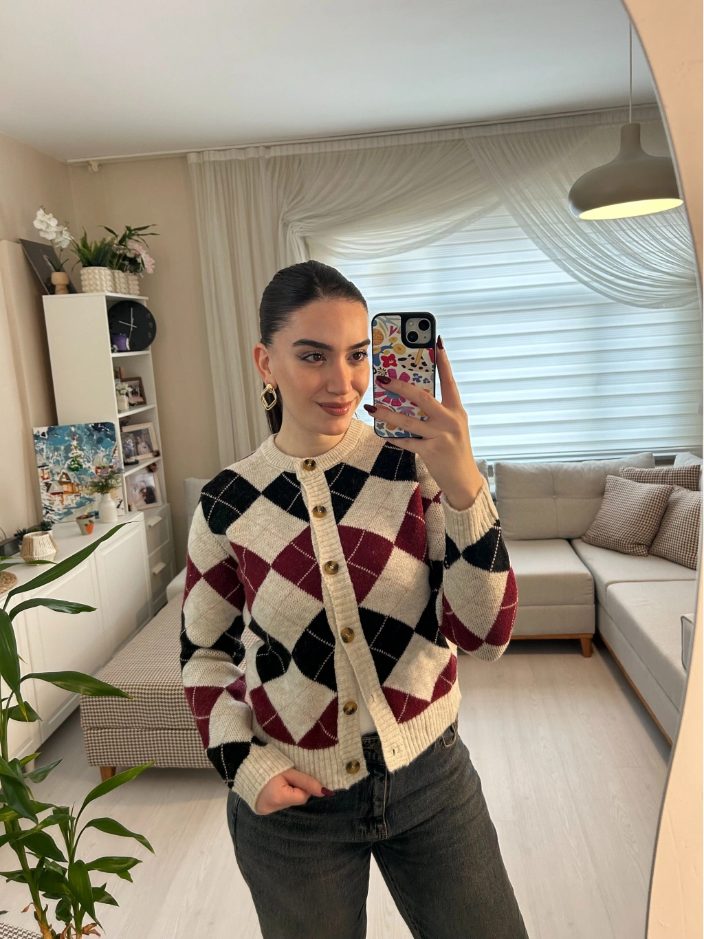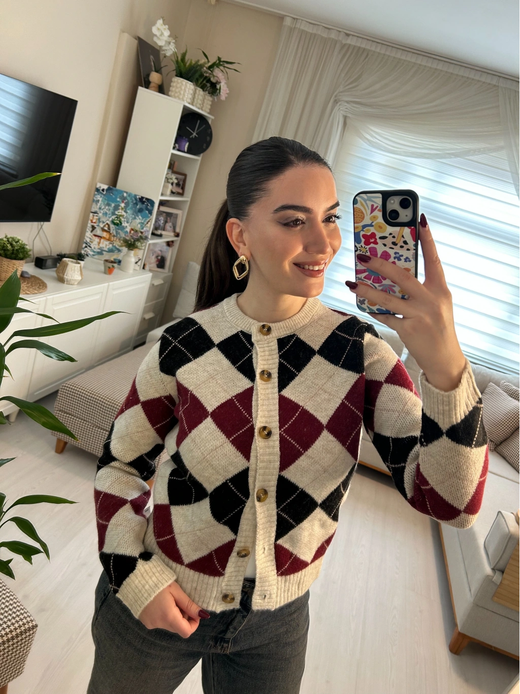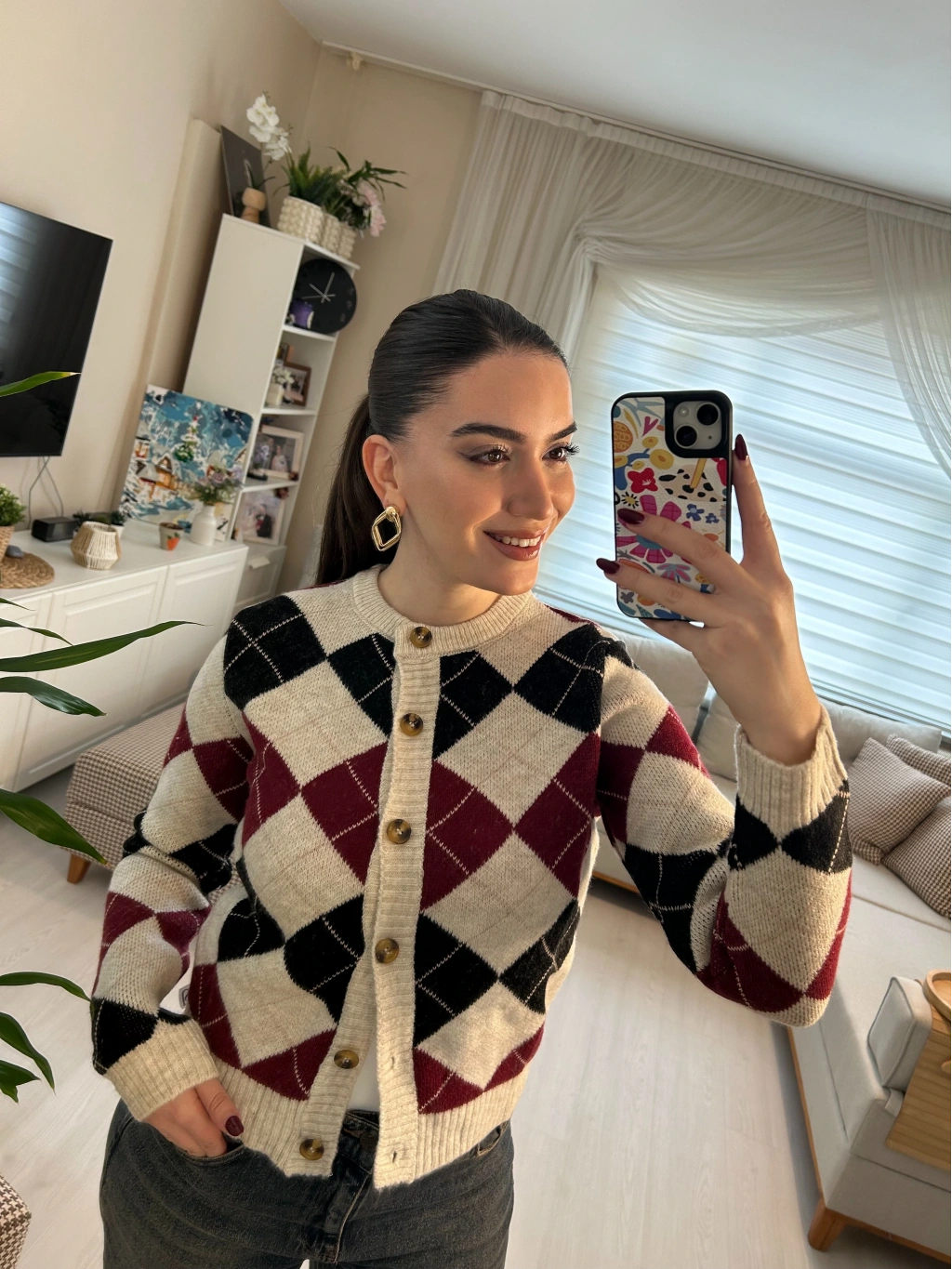 Krem Bordo Siyah Baklava Desenli Düğmeli Crop Triko Hırka