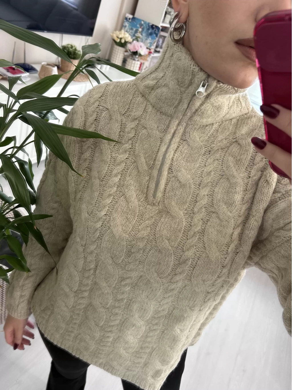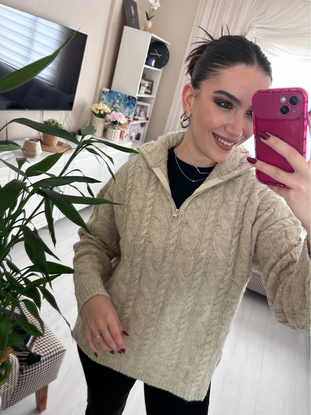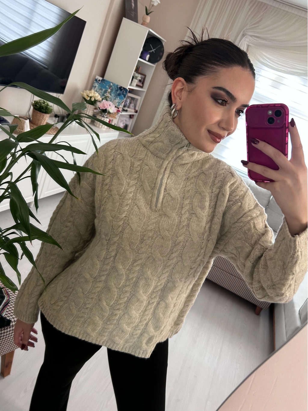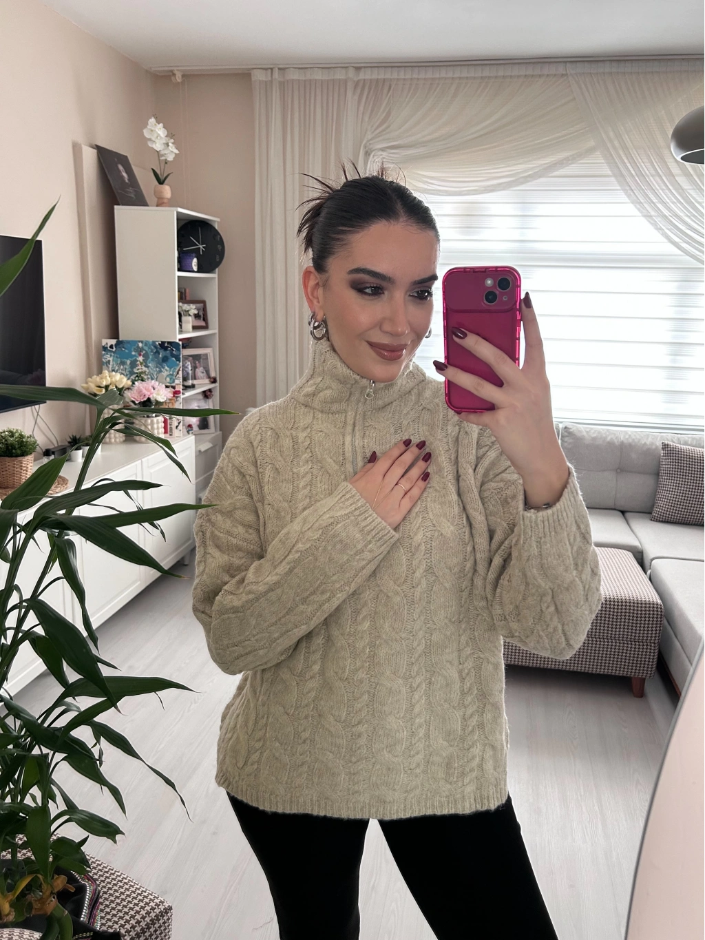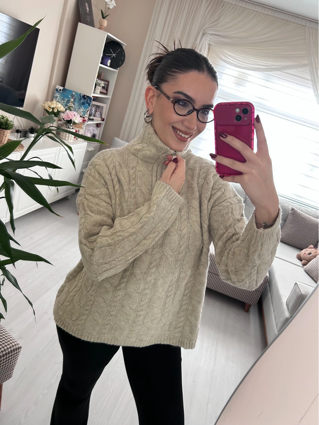 Kış sezonunun favori parçası olan krem örgü desenli yarım balıkçı kazak, sade ve zarif tasarımıyla dolabınızın kurtarıcısı olacak.
