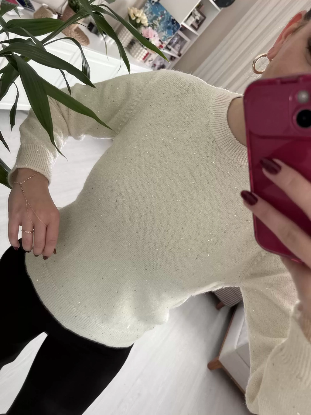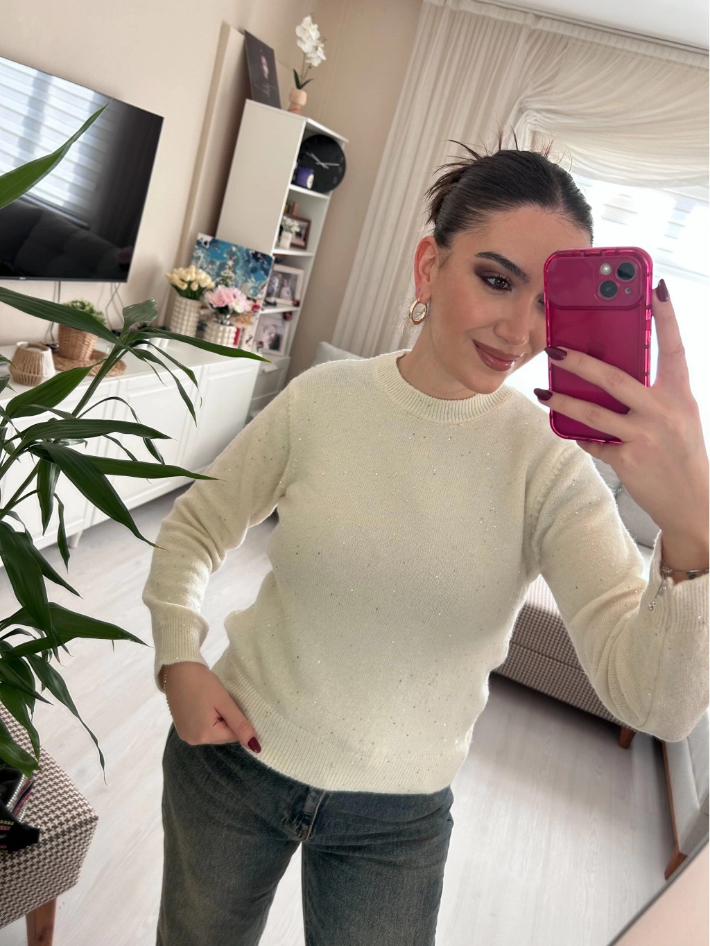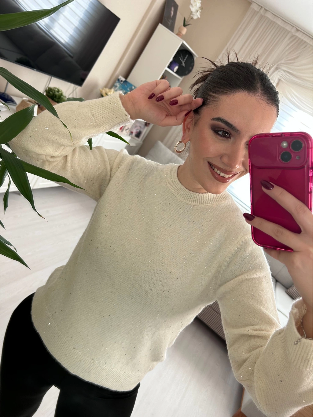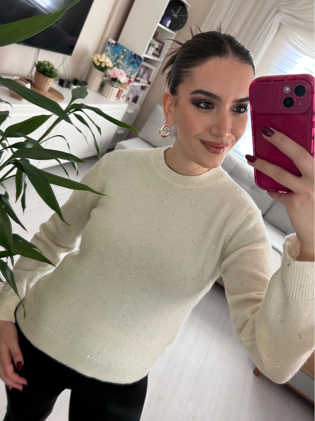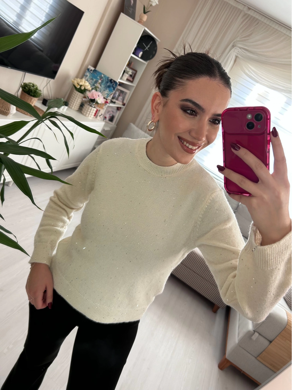 Kış sezonunun en zarif parçalarından biri olan krem simli basic triko kazak, minimalist tarzı seven kadınlar için özel olarak tasarlandı.