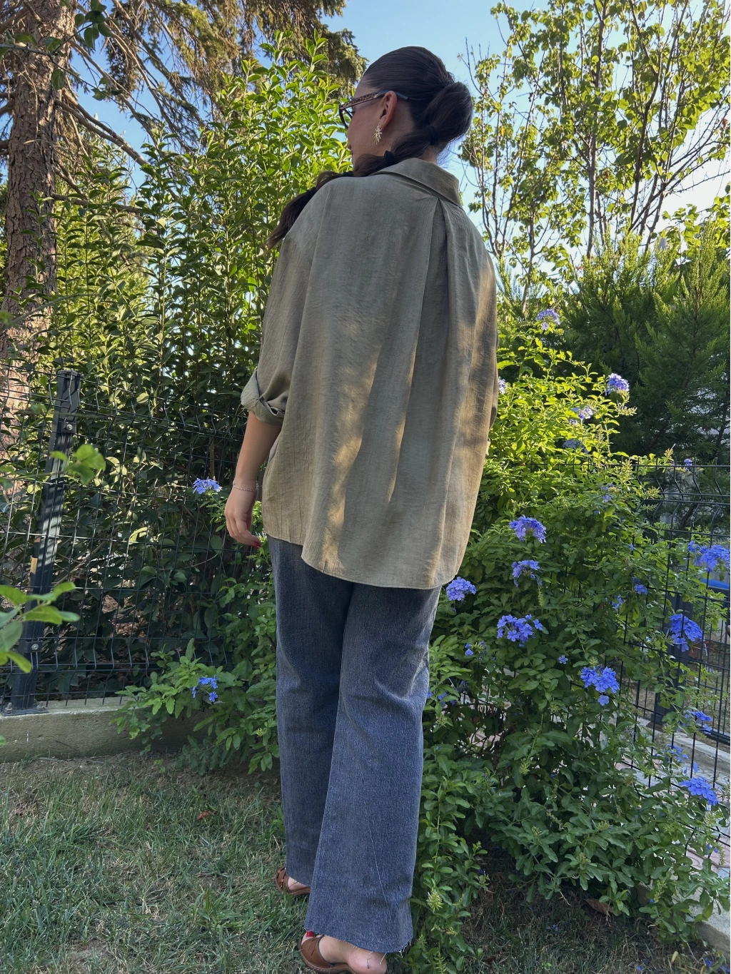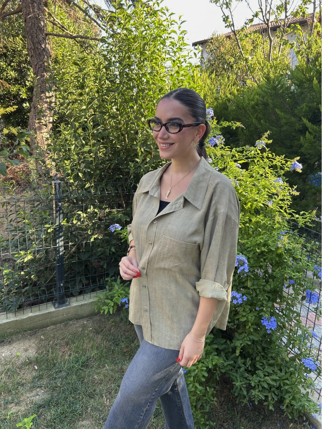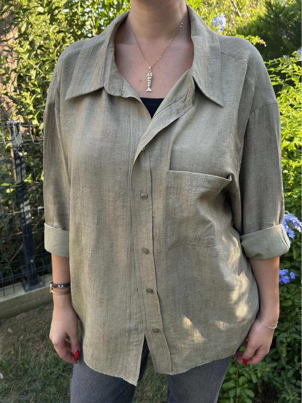 Rahat kalıbı ve doğal dokusuyla günlük kombinlerinize şıklık katan oversize haki gömlek.