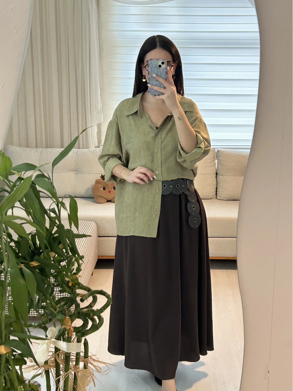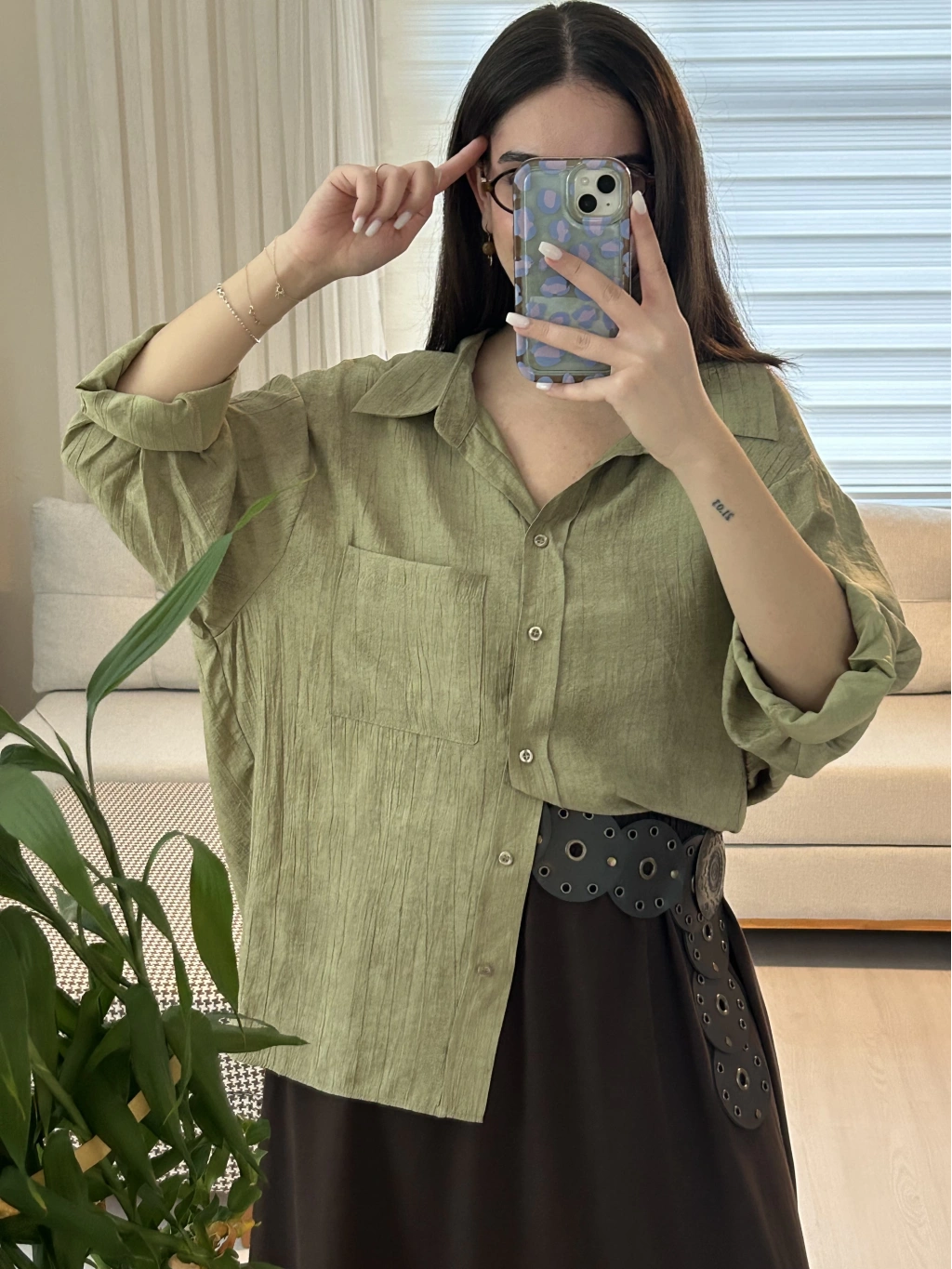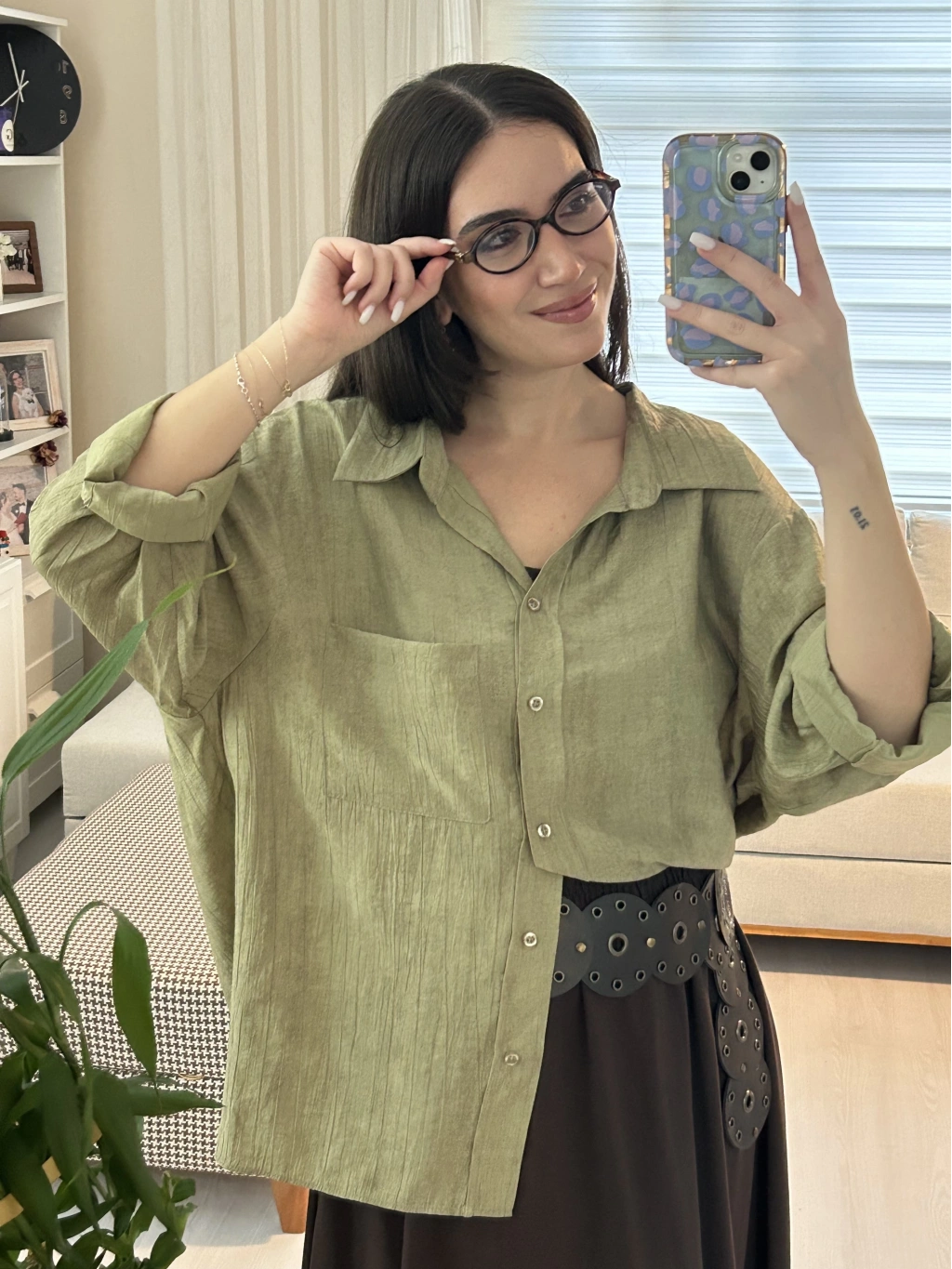 Rahat kalıbı ve doğal dokusuyla günlük kombinlerinize şıklık katan oversize haki gömlek.