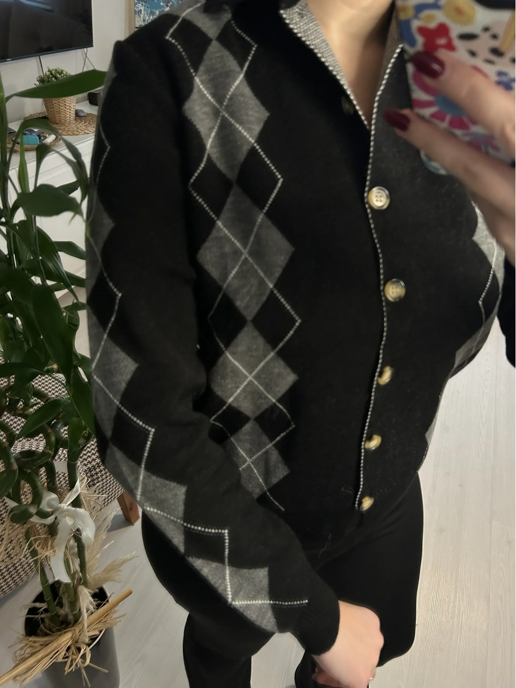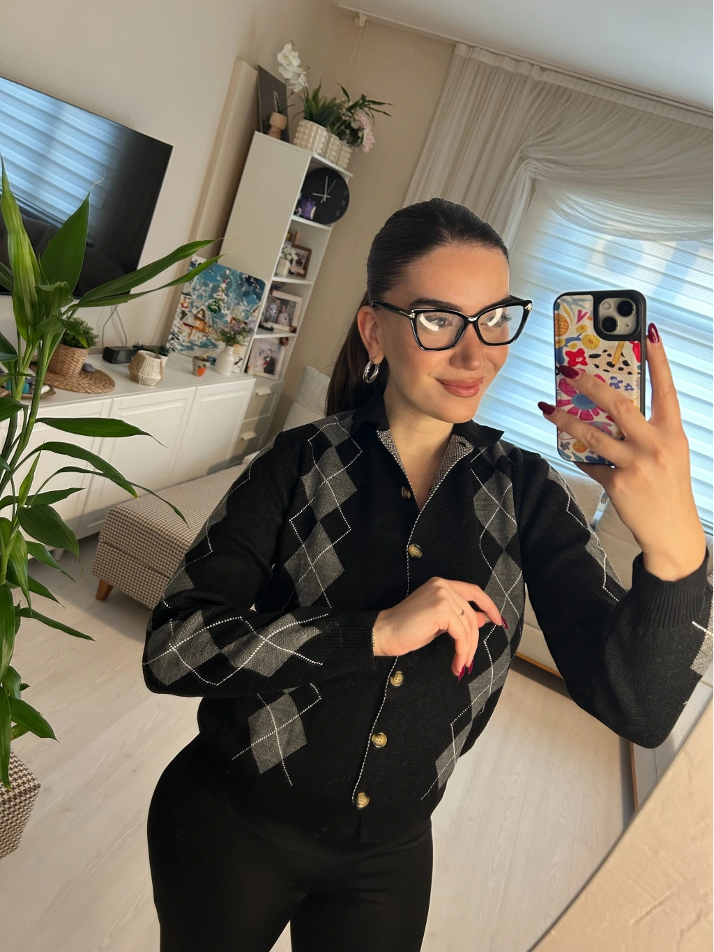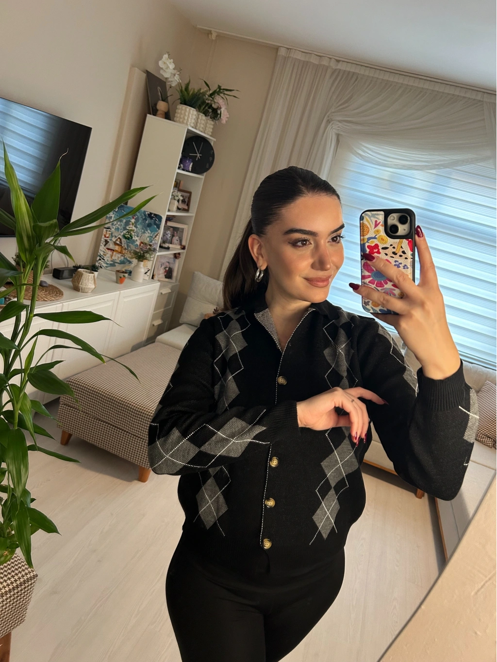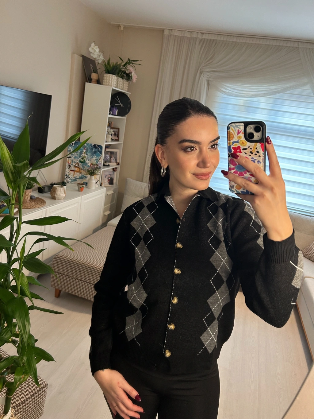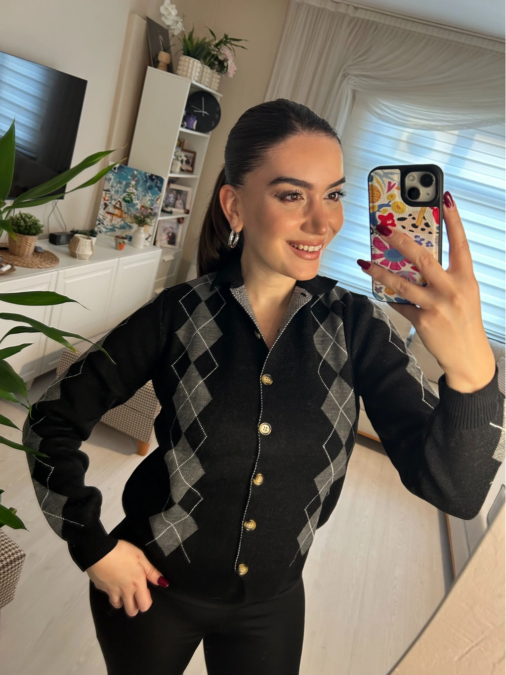Kolej havasını evine taşı! Siyah zemin üzerine gri baklava (argyle) desenli, gömlek yaka detaylı ve gold düğmeli triko hırka. Hem şık hem spor, her kombinin tamamlayıcısı.