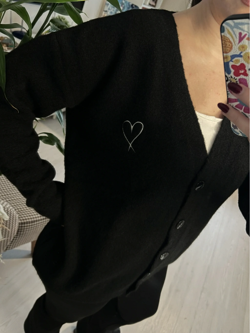 Küçük bir kalp, büyük bir aşk! Siyah yumoş triko hırka, göğsünde gümüş kalp nakışı ve düğmeli önüyle hem romantik hem cool. Salaş kalıbıyla her kombinin üstüne yakışır.