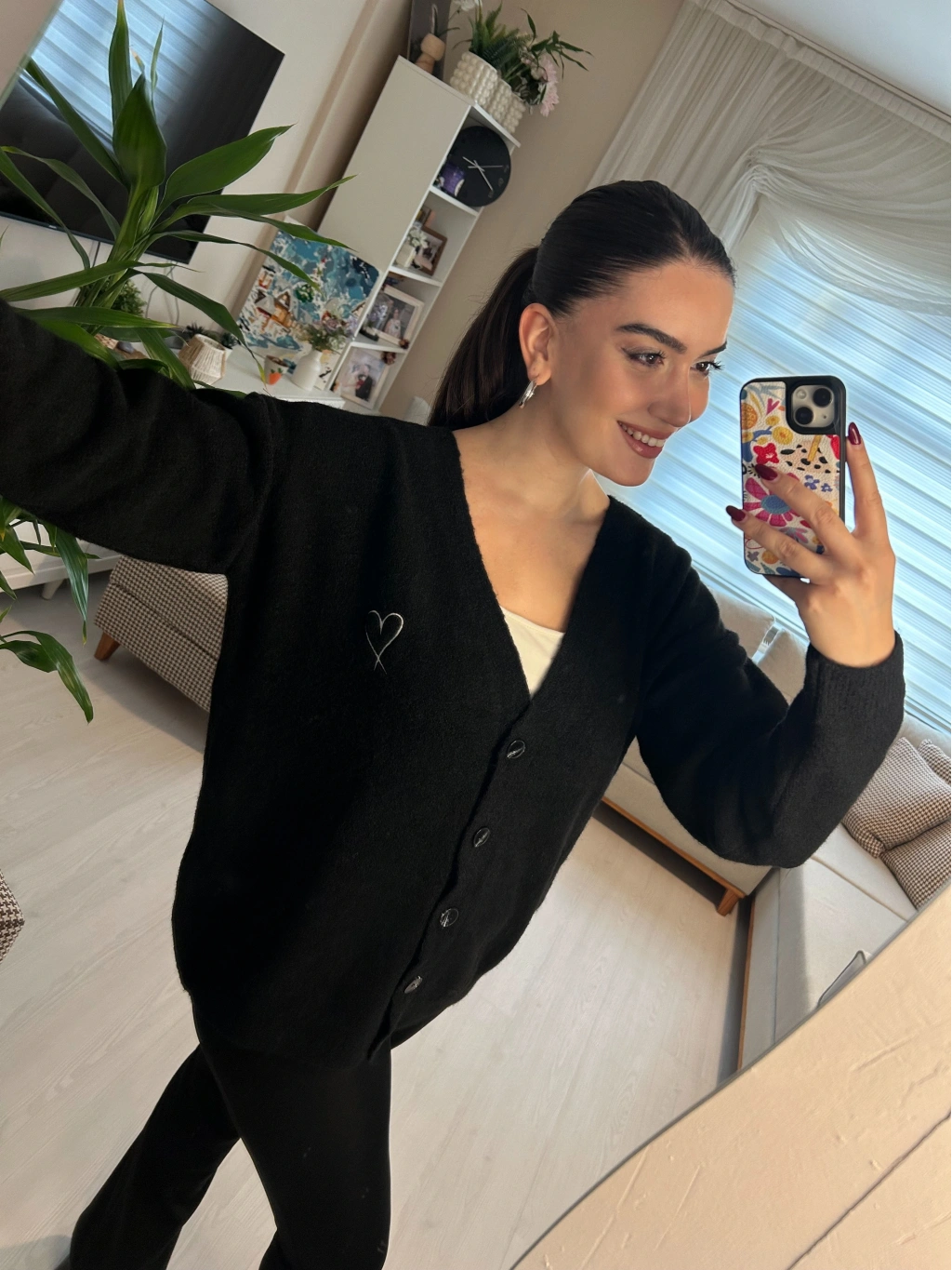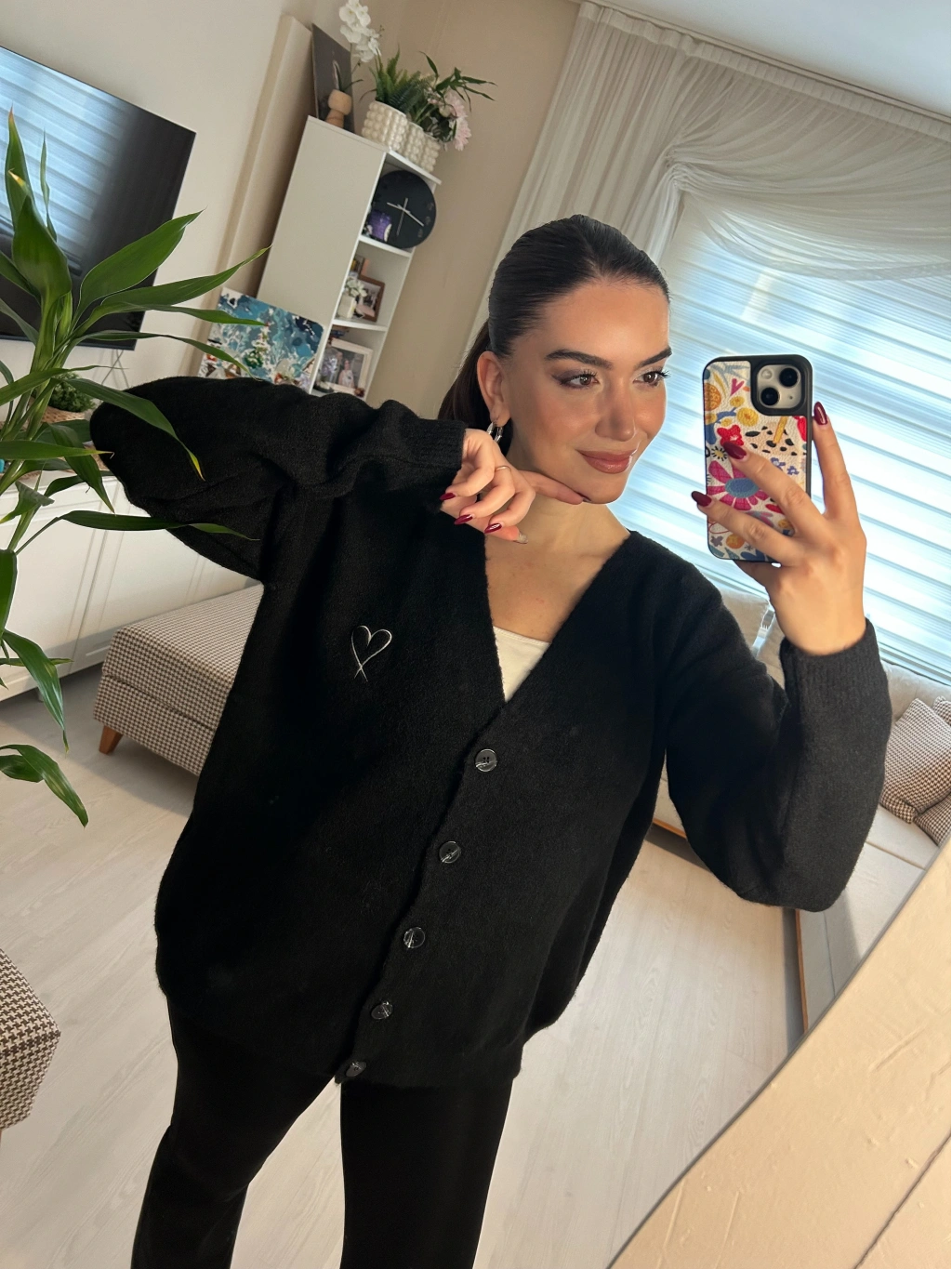 Selen Fashion’ın en romantik parçalarından biri. Minik kalp nakışı ile sıradan siyah hırkaya farklı bir hava katıyor, salaş kalıbıyla hem şık hem de rahat bir seçim.