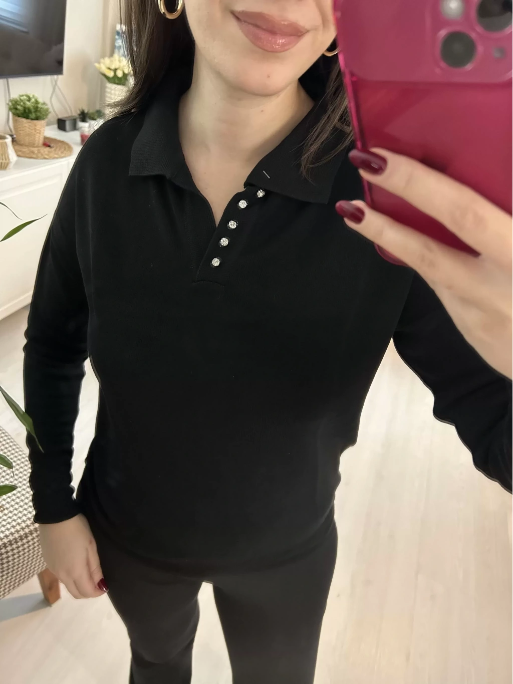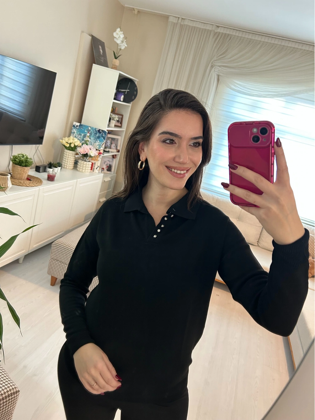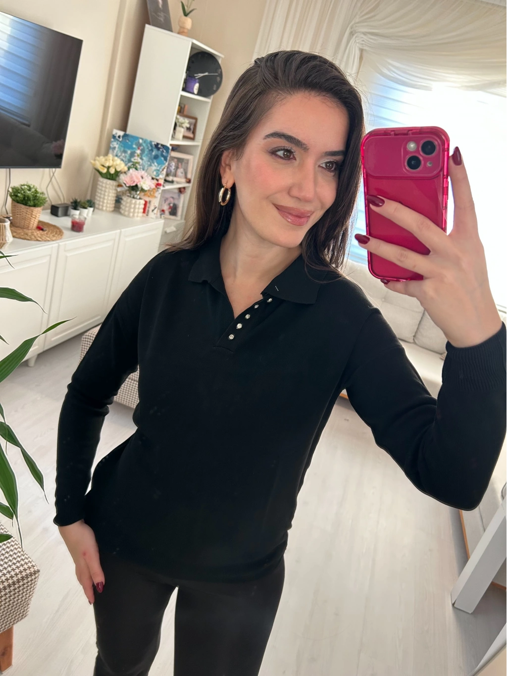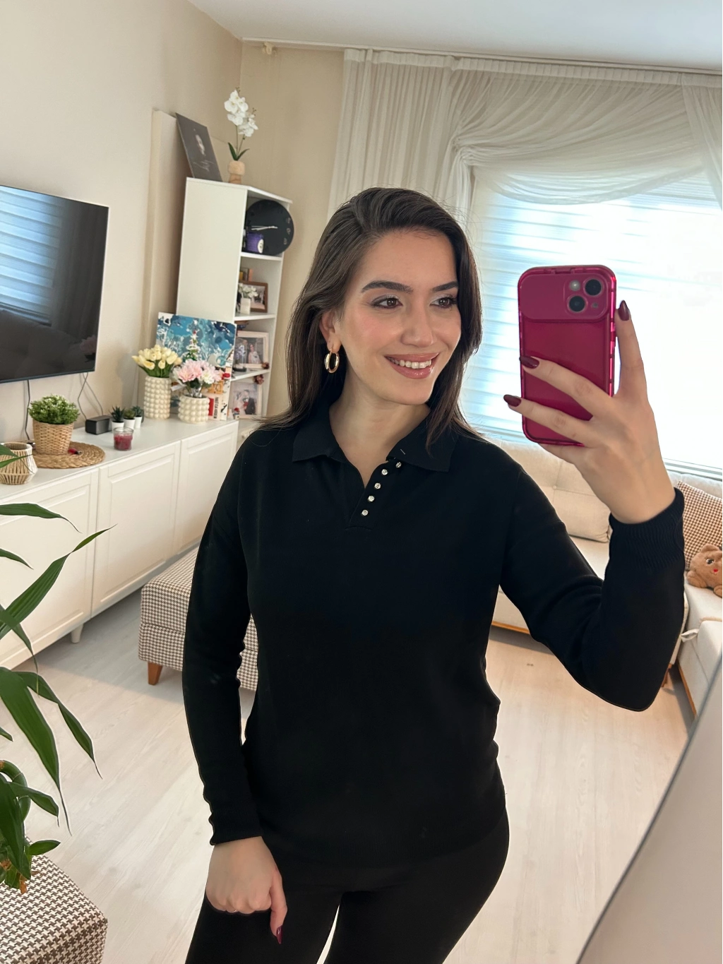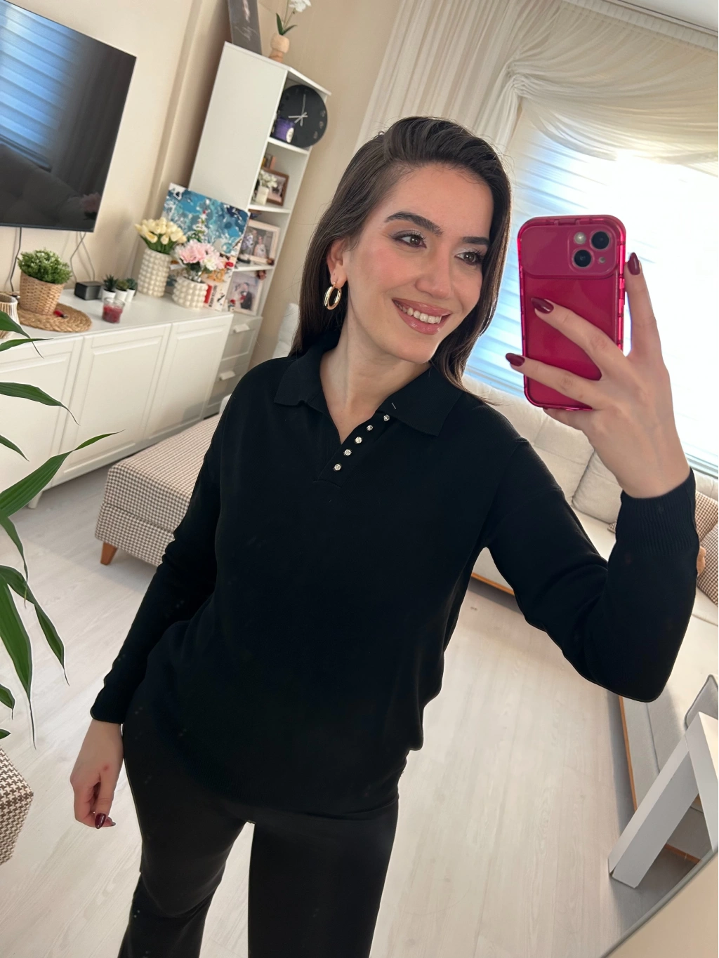 Selen Fashion’ın klasik çizgilerini modern detaylarla buluşturduğu Siyah Polo Yaka Düğme Detaylı Kadın Bluz, her kombinde zarif bir duruş sergiliyor.