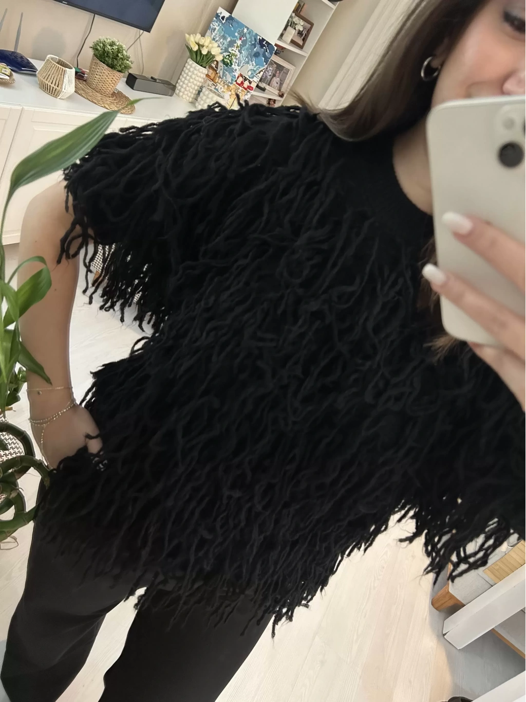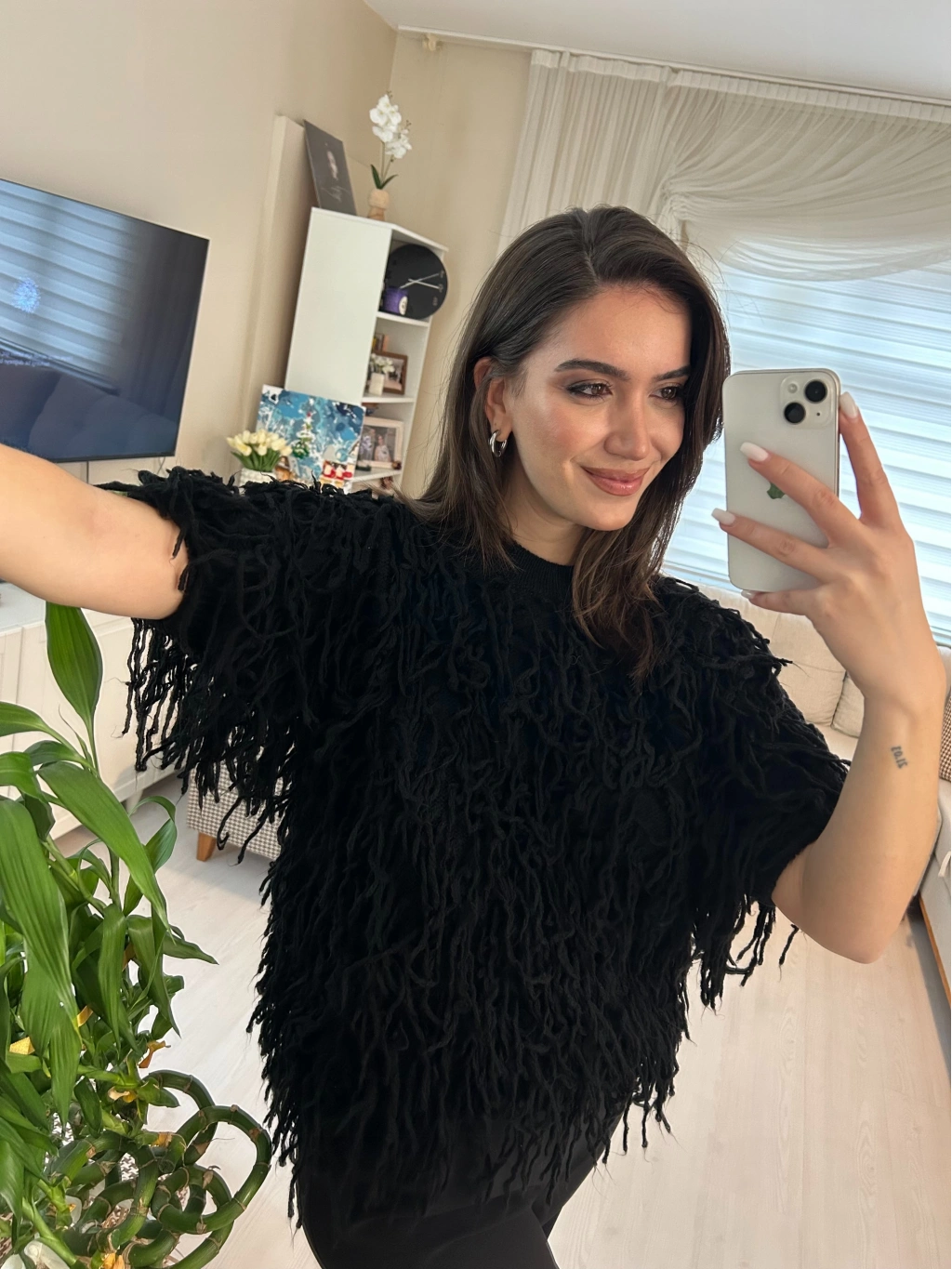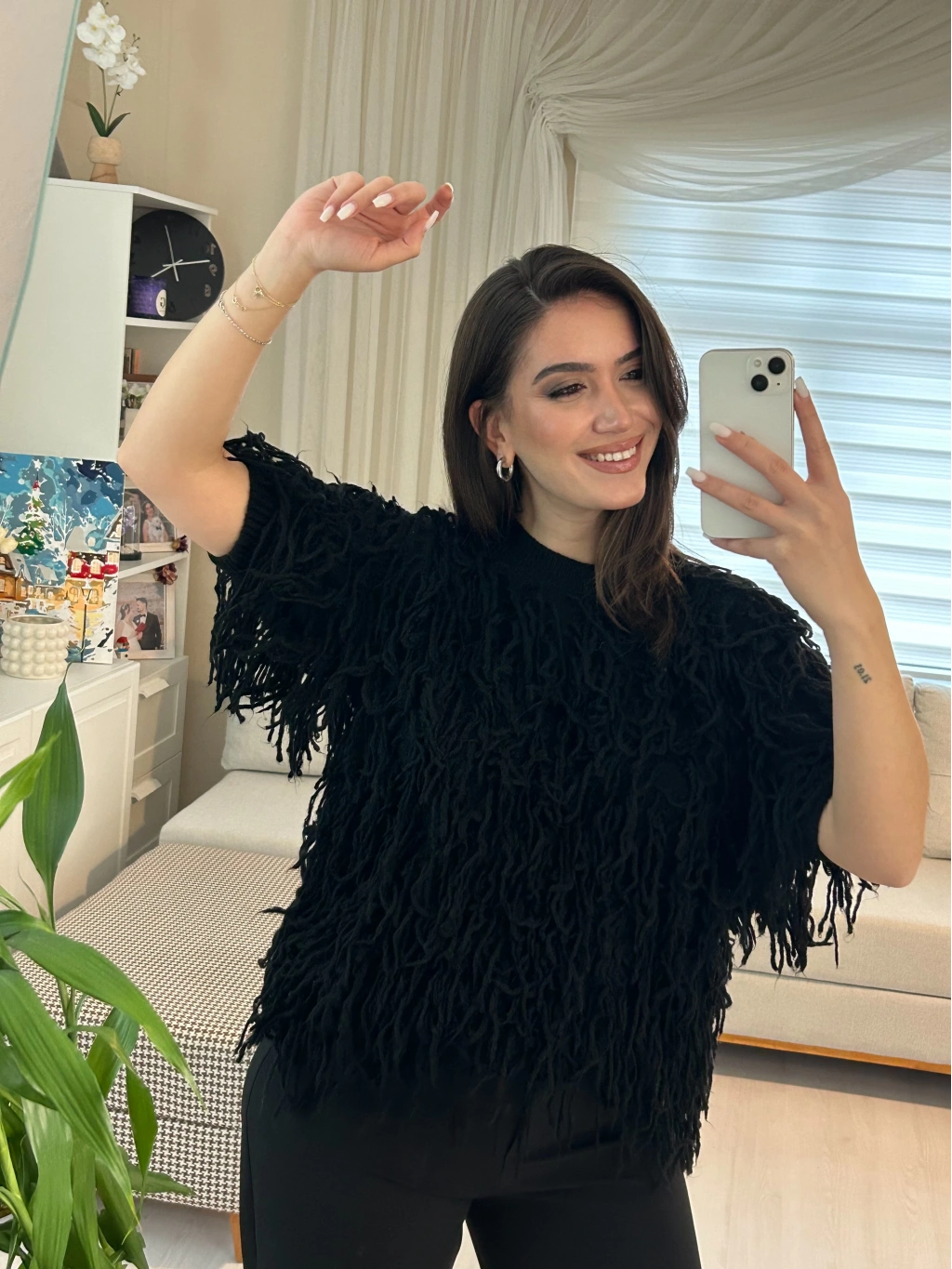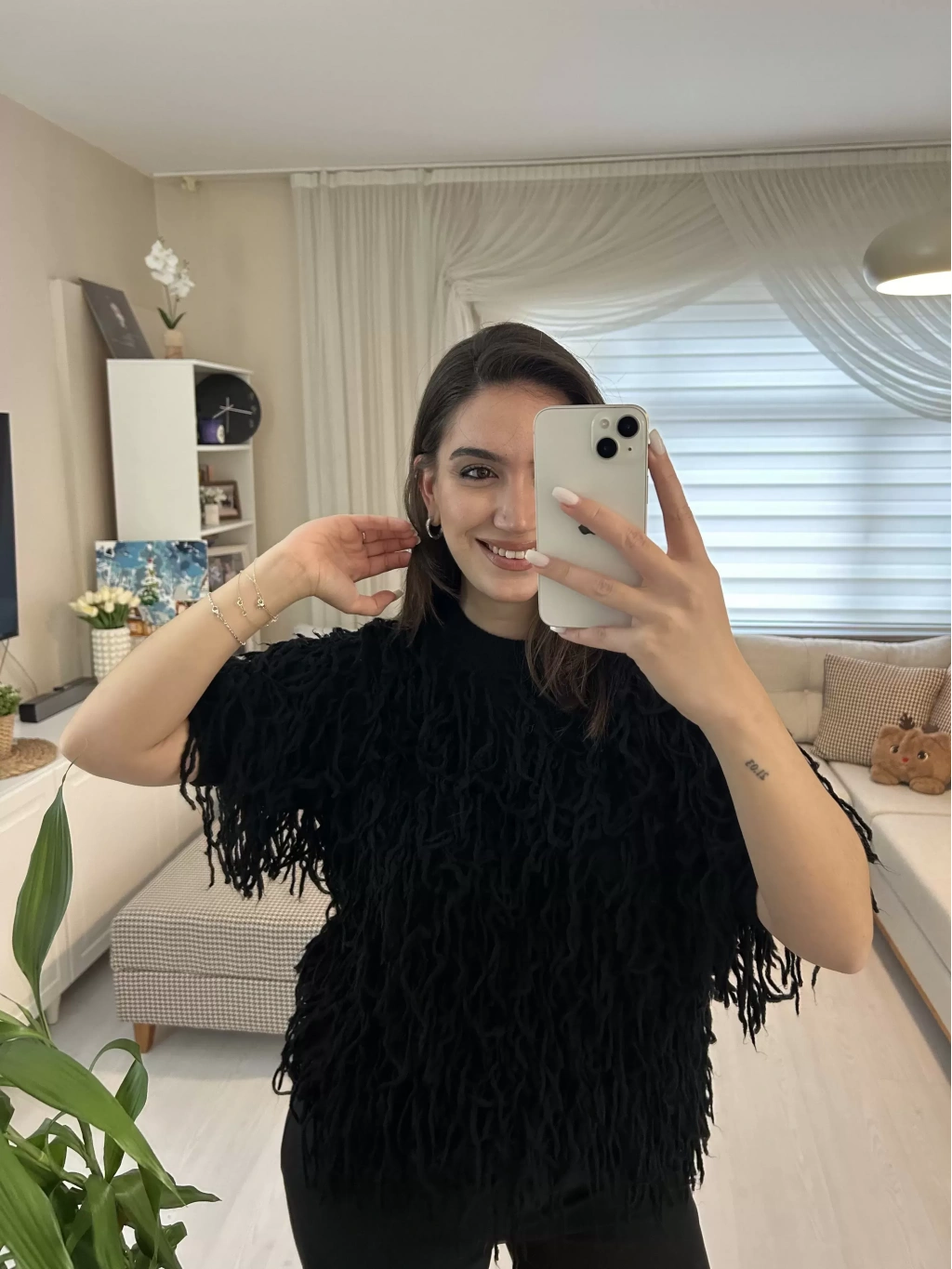Siyah saçaklı triko bluz, modern tasarımı ve şık görünümüyle öne çıkar. Rahat kalıbı sayesinde günlük kullanımda konfor sunarken, özel davetlerde de stilinizi tamamlar. Gardırobunuzda hem şık hem de kullanışlı bir parça olacaktır.