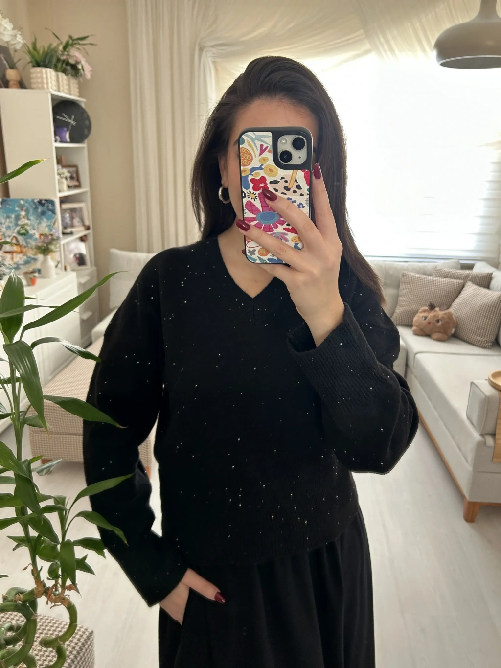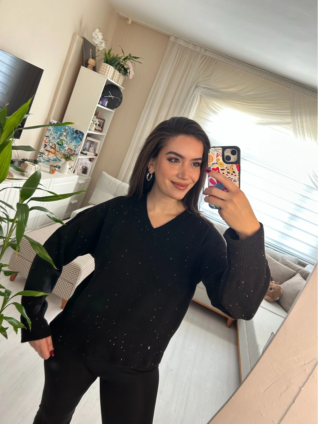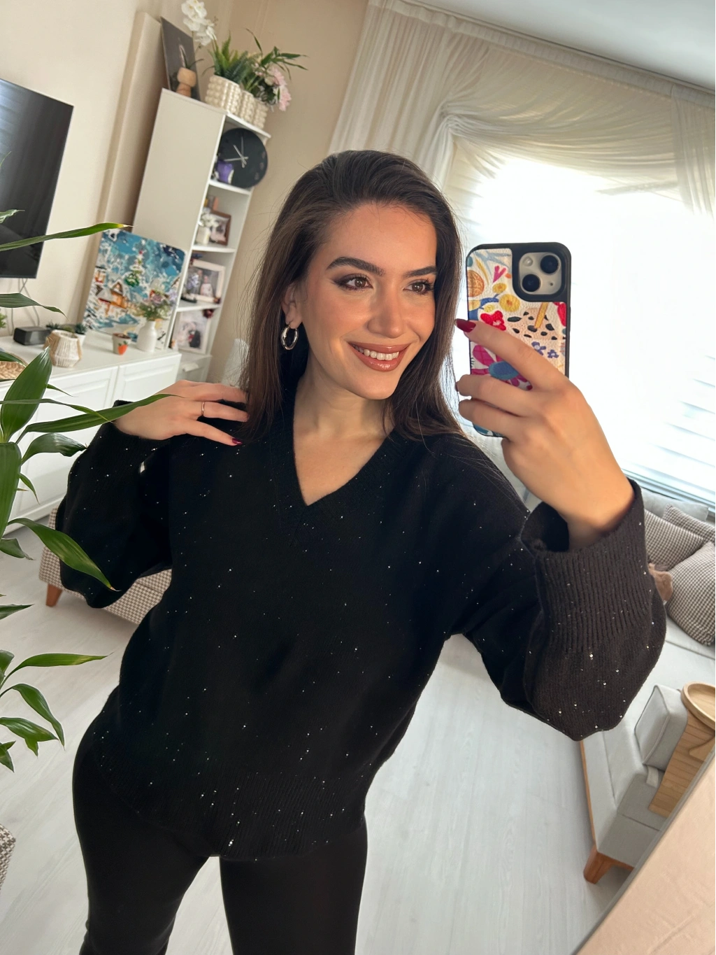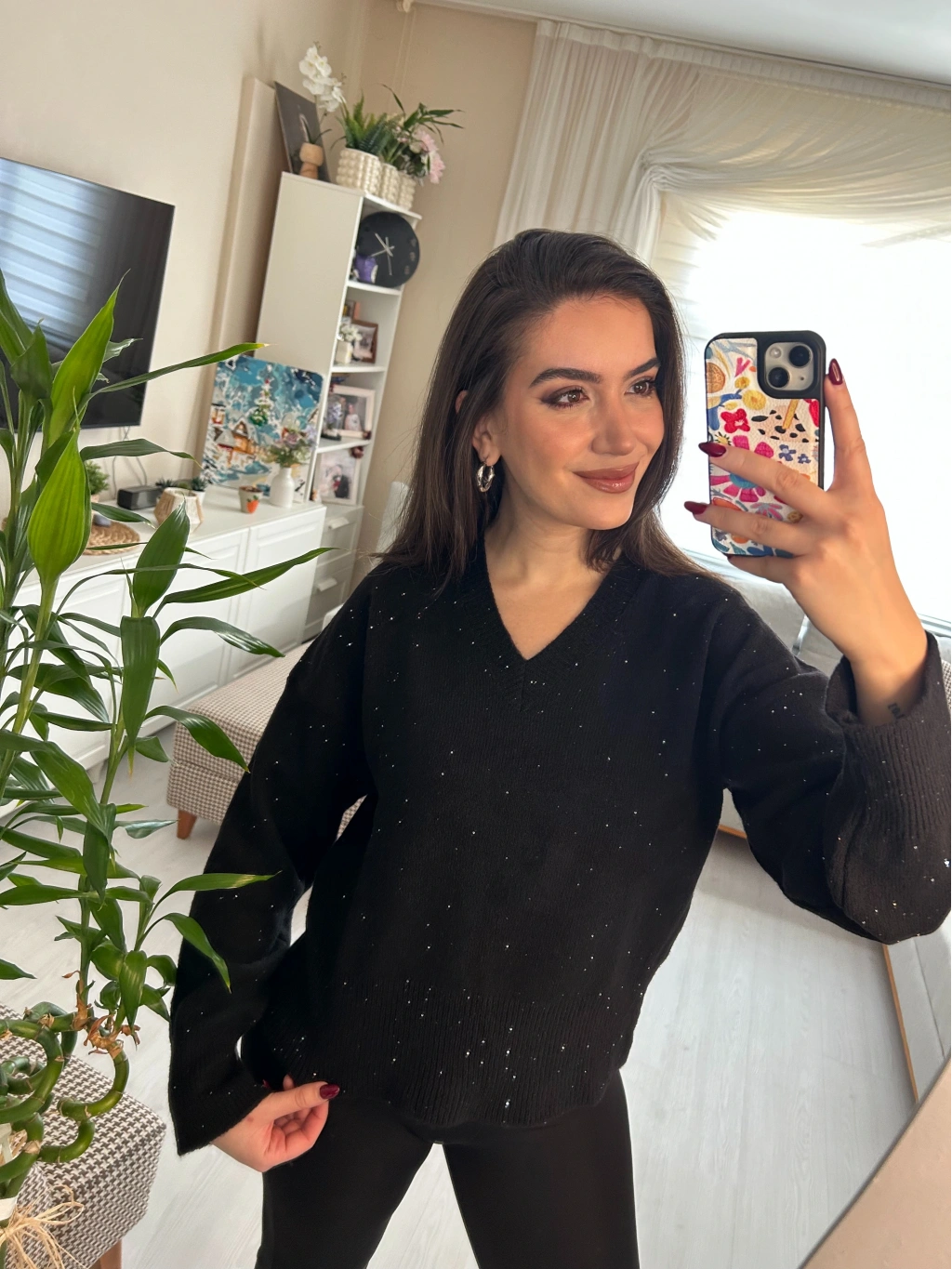 Gece parıltısını gündüze taşıyan siyah triko kazak! İnce ışıltılı taşları ve derin V yakasıyla hem şık hem de dikkat çekici. Özel davetlerden günlük kombinlere kadar her anınıza eşlik eder.