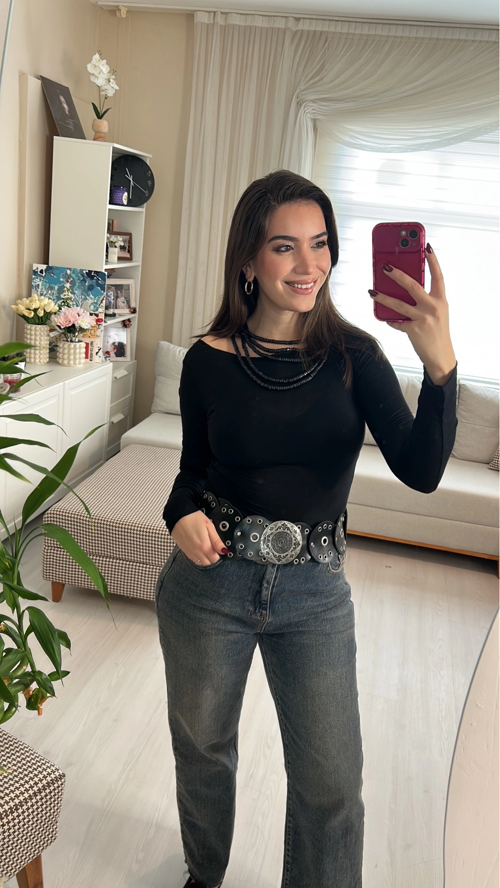 Jean, etek veya yüksek bel pantolonlarla mükemmel uyum yakalar.